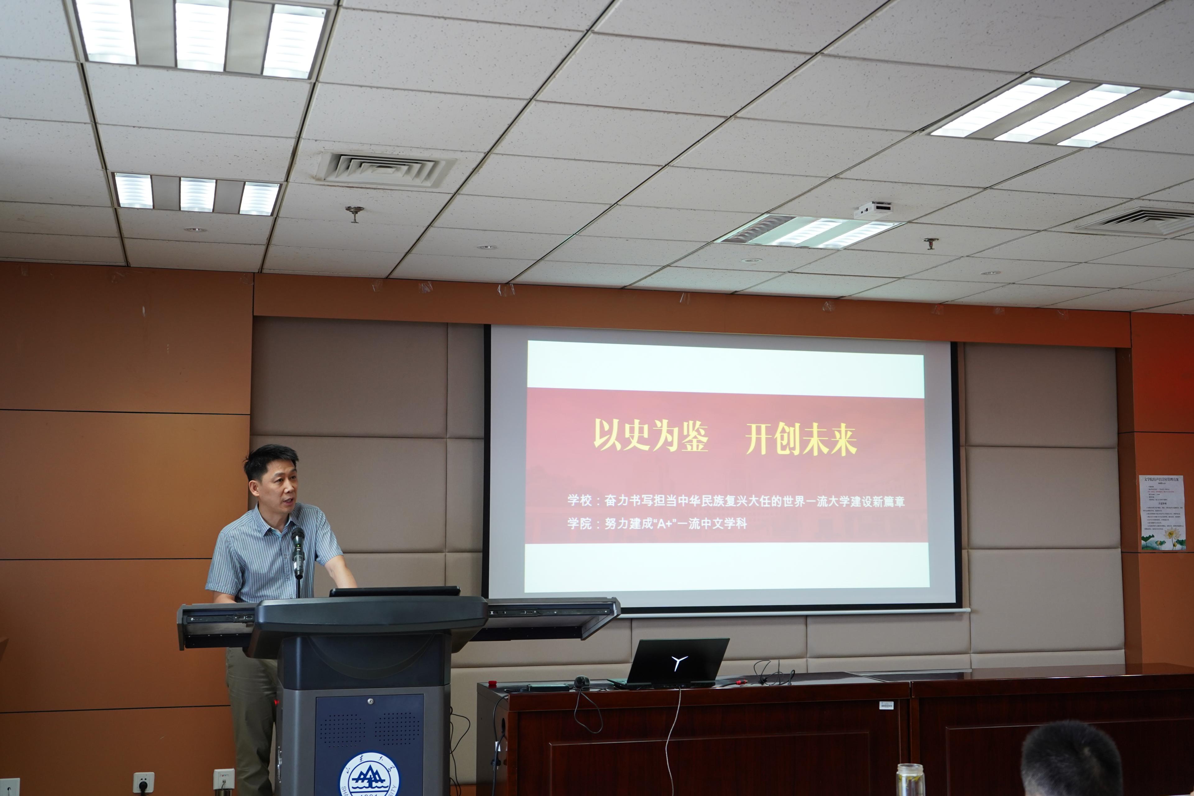 张帅首先带领与会人员学习了习近平总书记在庆祝中国共产党成立100周年大会上的重要讲话精神。他认为,“以史为鉴、开创未来”的思想方法和实践要求是我们学习此次“七一”讲话精神的重要抓手。回顾百年奋斗的光辉历程,中国共产党团结带领人民,不畏强敌、不惧风险、敢于斗争、勇于胜利,始终坚定理想信念,不忘初心使命。百年前的先驱们创建了中国共产党,“坚持真理、坚守理想,践行初心、担当使命,不怕牺牲、英勇斗争,对党忠诚、不负人民”的伟大建党精神就此形成。张帅强调,我们同样要将伟大建党精神作为涵养新时代山大精神和山大文化的精神之源,全体教职工应继承光荣传统,赓续红色血脉,秉承实事求是的优良传统和工作作风,为实现中文“A+”学科的目标而只争朝夕、艰苦奋斗。他勉励文学院全体教职工要积极主动把握习近平总书记“九个必须”的精髓要义,明确其实践要求;落实到思想和行动上,就是要以立德树人为根本,擦亮“教育报国”和“为国育贤”的办学初心,彰显“重情义、尚风骨、尊学术”的文院品格,为建设担当中华民族复兴大任的世界一流大学做出应有贡献。