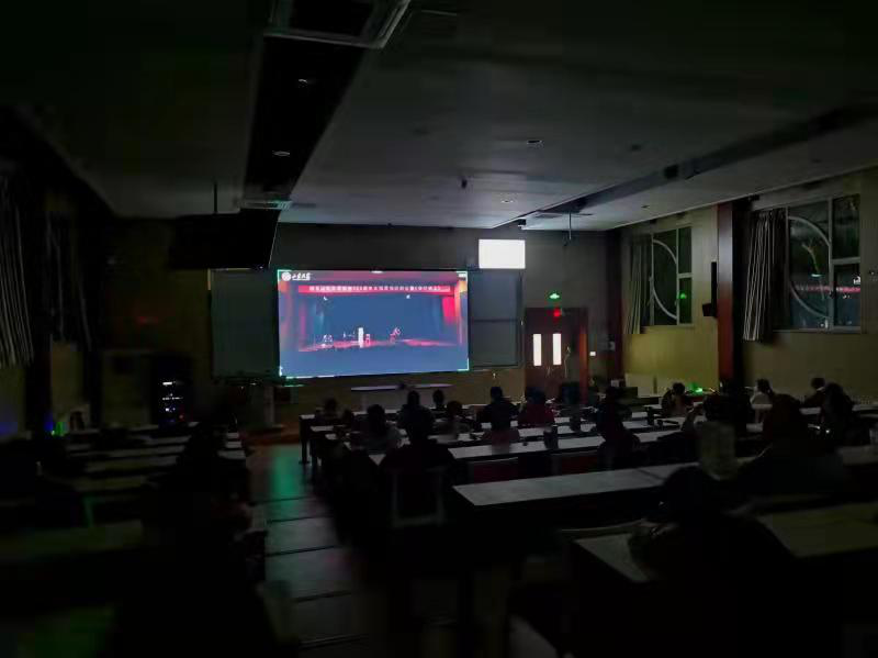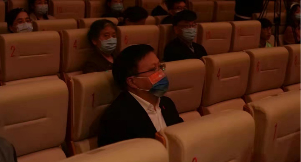 马克思主义学院党委书记马晓琳、党委宣传部副部长鞠晗、党委宣传部新闻中心副主任万广远,248cc永利集团现当代文学专业教授史建国、副书记王萌等嘉宾受邀观看演出。演出严格落实疫情防控相关要求,于知新楼和电教北楼设立视频直播分会场,现场观众凭票入场、核验绿码、测温登记、隔座就坐、全程佩戴口罩,来自各个学院、年级共近240名观众在音乐厅现场观看演出,另有300余名同学收看直播。