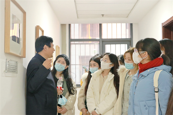 知新楼五楼院史墙主题为“文院历史”,以山大文院学者及代表作照片为主。杜泽逊认为,历史照片应与时代吻合,展现历史真实性。在参观本楼层照片墙时,杜泽逊详细介绍了《中国文学史》的编著人员和编纂内容,强调了山东大学在此书编纂过程中的主导地位。此外,五楼还是248cc永利集团图书室所在地。杜泽逊为同学们详述了图书室八块匾额的名称及来源,“借书园”为清代学者周永年藏书之所,“碧虑簃”则是现代作家、文学史家、画家黄孝纾先生之堂号,其余六块也都取自名家藏书室之名,冀文院学子能仪型模范、见贤思齐,发扬名家之风骨与精神。