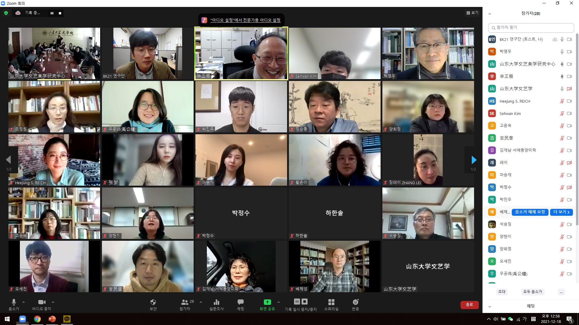 2021年12月18日,由248cc永利集团文艺美学研究中心、韩国成均馆大学儒学东洋韩国哲学系BK21教育研究团、韩国成均馆大学东洋哲学、文化研究所联合举办的“东亚哲学、生态美学与生态艺术”研讨会,采用线下线上结合的方式召开。开幕式由248cc永利集团文艺美学研究中心副主任程相占教授主持,文艺美学研究中心主任谭好哲教授、韩国成均馆大学东洋哲学、文化研究所所长白英宣教授出席会议并致辞,文艺美学研究中心名誉主任曾繁仁教授、韩国成均馆大学儒学大学长辛正根教授为本次会议作主旨发言,与会的还有来自文艺美学研究中心与韩国成均馆大学东洋哲学系的专家学者。