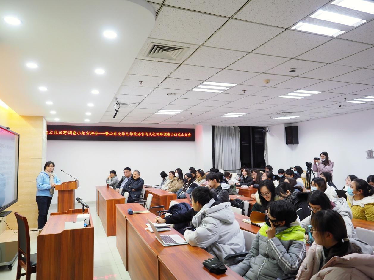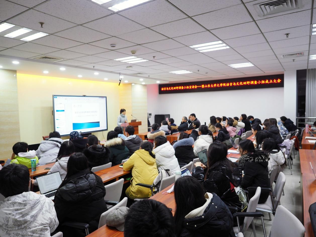 接下来,张燕芬副教授向同学们宣讲语言与文化田野调查小组章程及注意事项。该小组以山东大学方言研究中心和山东大学语言科学实验中心为依托,邀请张树铮、岳立静、刘娟、张燕芬等担任指导教师,旨在保护方言资源,传承中华优秀传统文化。小组的活动专业性与个性化相结合,分为集体田野调查和个人田野调查两部分,集体田野调查与教师的科研任务结合,于节假日不定期举行,每次调查活动人数筛选精控在15人以内;个人田野调查由学生于寒暑假回家时通过录音录像等方式自行开展,主要包括童谣、民歌、手工艺、农耕农具等主题。采录后的材料上交指导教师择优进行展示,有进一步研究价值的素材可以展开后续的调查和研究。