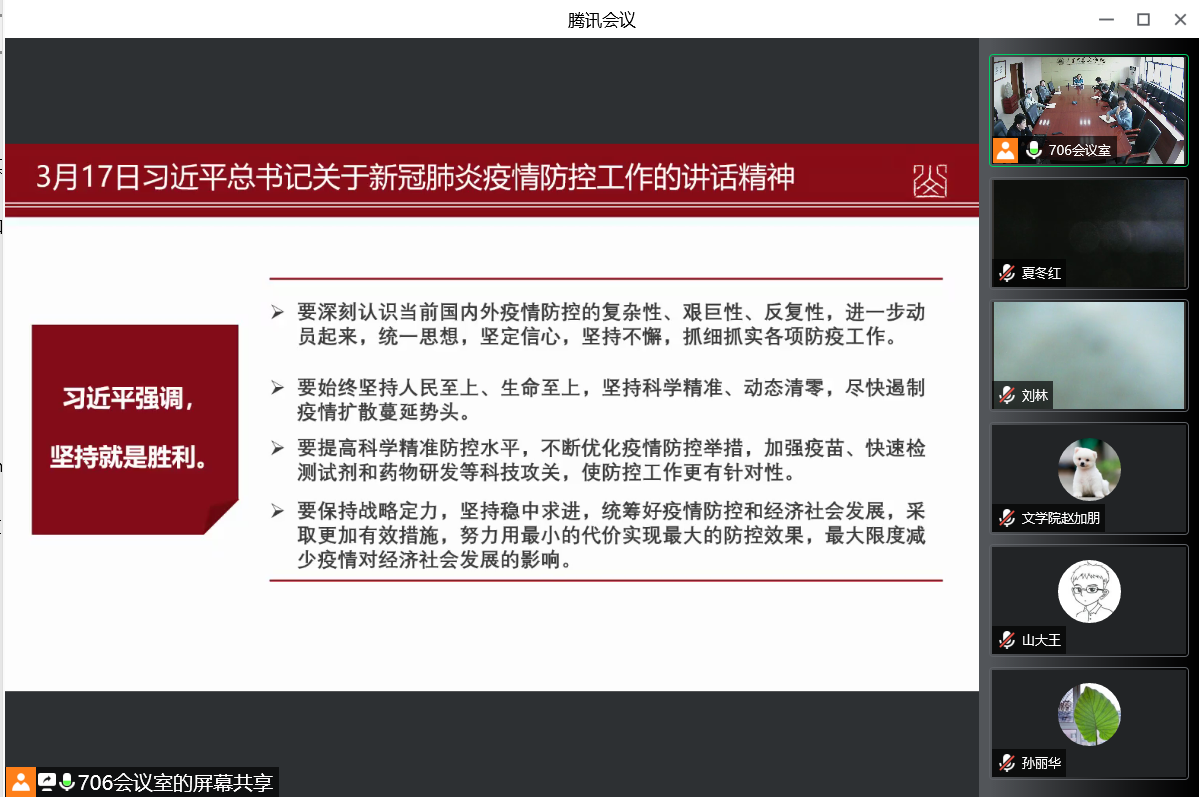 最后,张帅带领全体教职工深入学习了学校封闭期间对教职员工的工作要求。他指出,要深刻认识当前国内外疫情防控的复杂性、艰巨性、反复性和做好疫情防控工作的极端重要性、紧迫性,把思想和行动统一到党中央、教育部、山东省委省政府工作要求上来,统一到学校党委落实举措上来,坚定战胜疫情的信心,坚持不懈打赢疫情防控阻击战。张帅对学院疫情防控工作提出四点要求:一是牢固树立底线意识,遵守属地、社区和学校的各项防疫规定;二是坚守育人初心,时刻以学生为中心,加强对学生的关心关爱,保证线上教学质量;三是加强个人防护,做自己身体健康和生命安全的第一责任人;四是以身作则、规范言行,不私自发布学校疫情防控工作相关信息,不信谣、不传谣,防范化解意识形态和重大舆情风险。