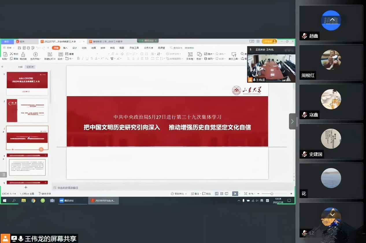 会议首先学习了习近平总书记在中共中央政治局第三十九次集体学习上的讲话精神。此次讲话主题为“把中国文明历史研究引向深入,推动增强历史自觉,坚定文化自信”。张帅指出,此主题与去年习近平总书记给《文史哲》编辑部全体编辑人员的重要回信内容相呼应,二者皆强调通过文化建设达到“坚持中国道路,弘扬中国精神,凝聚中国力量”的目的。他表示,中国共产党一贯强调用历史唯物主义立场看待中华民族历史、继承和弘扬中国传统文化。经过几代学者接续努力,中华文明探源工程等重大工程不断推进,人们对中华文明的起源、形成、发展历史脉络等有了较为清晰的认知。然而,该工程取得的成就仍是初步的、阶段性的,这要求相关研究人员坚持多学科、全方位的研究方法和理念,拓宽研究时空范围和覆盖领域,进一步回答好中华文明起源、形成、发展的基本图景等重大问题。他强调,中华文明源远流长、博大精深,是中华民族独特的精神标识,也是中国文化创新的宝藏。因此,各教职员工应当深入了解中华文明五千年文明史,坚持古为今用、推陈出新,建立中国特色、中国风格、中国气派的文明研究学科体系、学术体系、话语体系,促使世界读懂中国,也为人类文明新形态实践提供理论支撑。