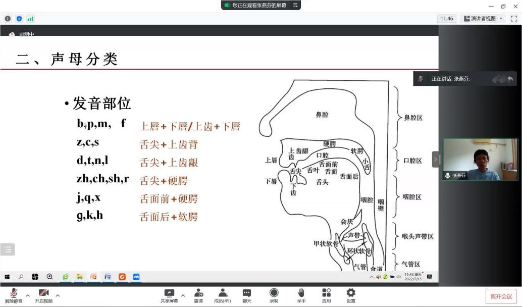 最后,张燕芬老师从理论和教学实践两个方面向助教同学们传授了普通话声母在线教学的经验与方法,以视频、图文结合等方式再现普通话声母的发音部位和发音方法。答疑环节,同学们积极提出自己的疑惑,请教声母教学方法,张燕芬老师和梁昌维老师耐心细致地解答了同学们的疑问,并和同学们探讨提升教学课件质量和教学效果的方法。会议在老师和同学们的热烈交流中圆满结束。