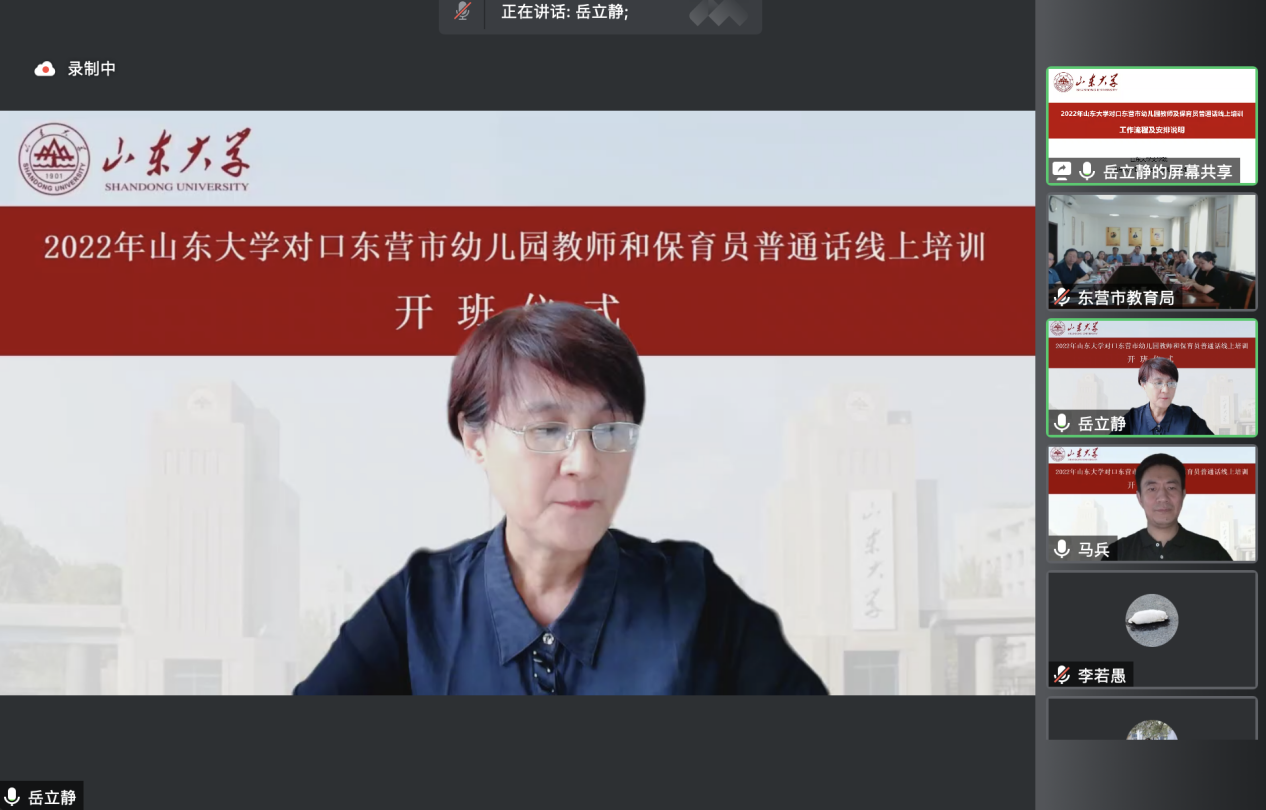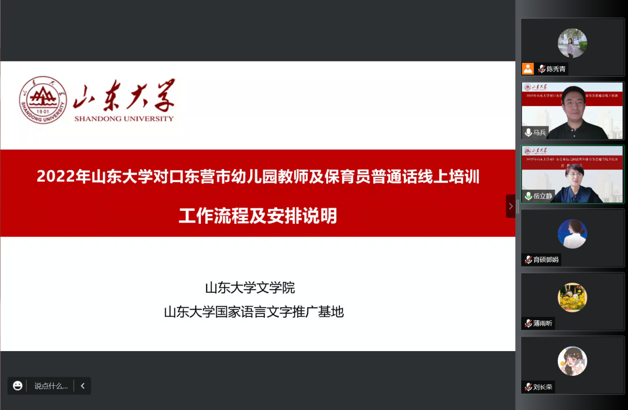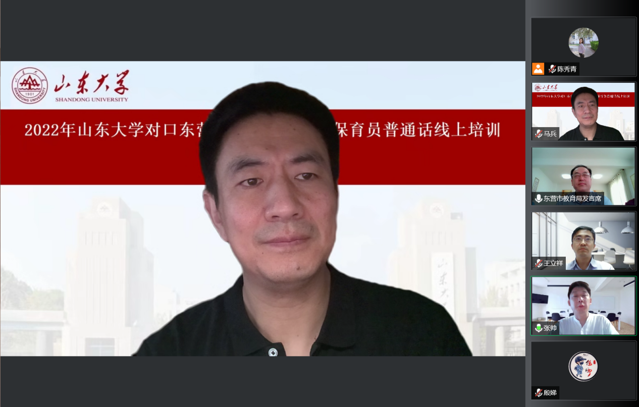 7月30日上午,山东大学国家语言文字推广基地对口东营市幼儿园教师及保育员普通话线上培训活动开班仪式成功举行。本次开班仪式由山东省教育厅语委办主办,东营市教育局语委办、山东大学国家语言文字推广基地和248cc永利集团联合承办。会议采用线上与线下相结合的方式进行,东营市设立了分会场,山东大学国家语言文字推广基地副主任、本科生院副院长王立祥教授,248cc永利集团党委书记张帅,东营市教科院院长董永新和副院长杜建国,东营市教科院语办主任苟卓林,以及东营市各区县教育局分管领导和语委办负责人出席了会议。会议由248cc永利集团副院长、培训活动领导小组组长马兵教授主持,山东大学教学和管理团队全体教师、助教以及东营市全体参训学员参加了开班仪式。