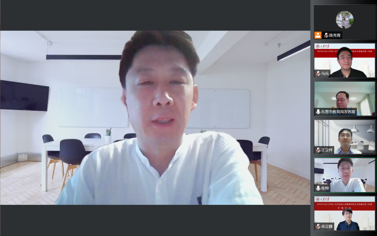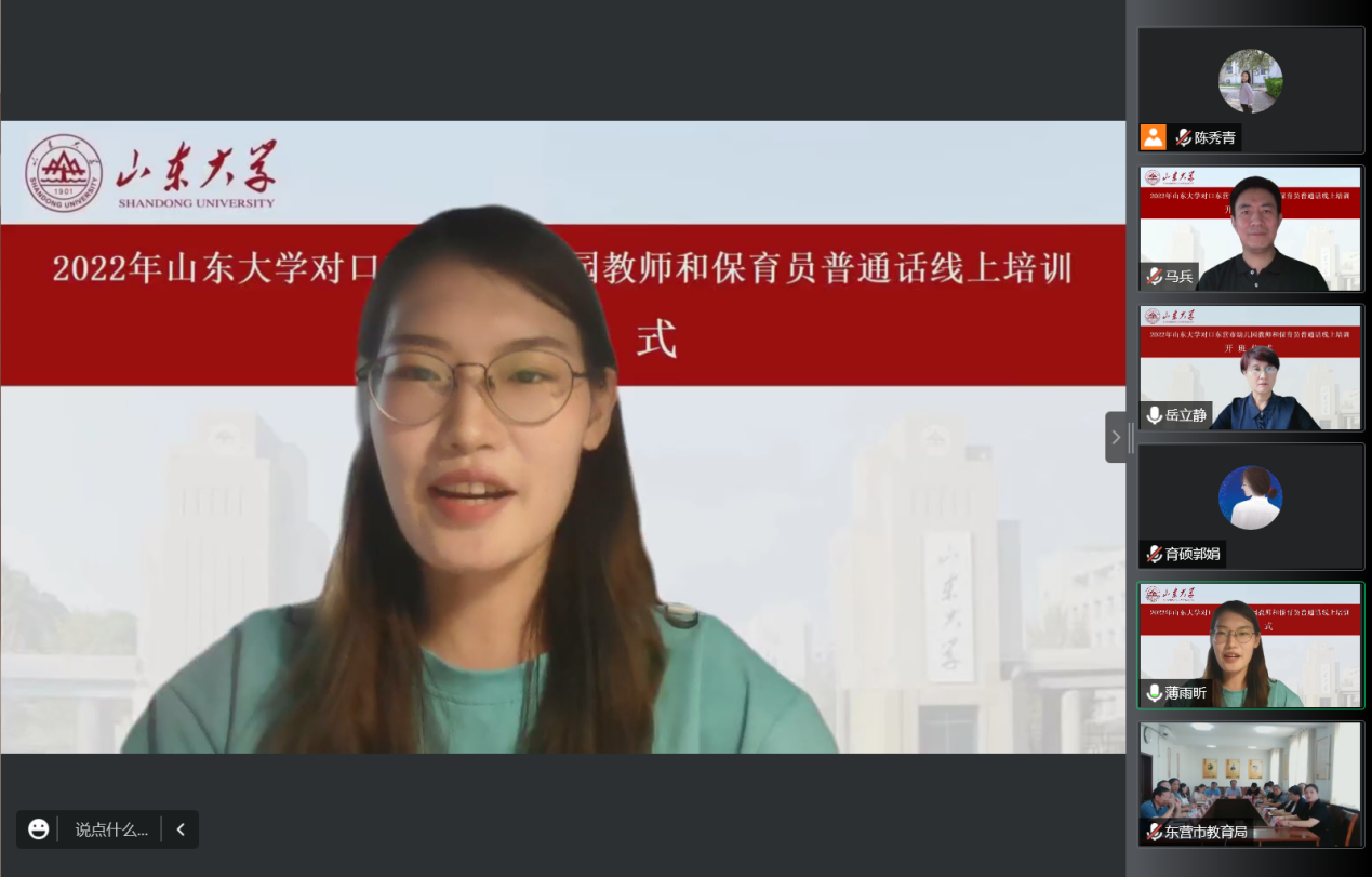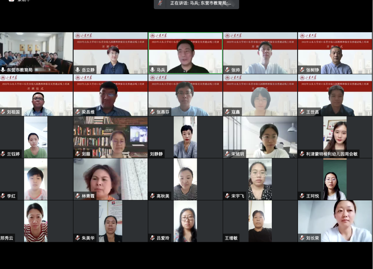 7月30日上午,山东大学国家语言文字推广基地对口东营市幼儿园教师及保育员普通话线上培训活动开班仪式成功举行。本次开班仪式由山东省教育厅语委办主办,东营市教育局语委办、山东大学国家语言文字推广基地和248cc永利集团联合承办。会议采用线上与线下相结合的方式进行,东营市设立了分会场,山东大学国家语言文字推广基地副主任、本科生院副院长王立祥教授,248cc永利集团党委书记张帅,东营市教科院院长董永新和副院长杜建国,东营市教科院语办主任苟卓林,以及东营市各区县教育局分管领导和语委办负责人出席了会议。会议由248cc永利集团副院长、培训活动领导小组组长马兵教授主持,山东大学教学和管理团队全体教师、助教以及东营市全体参训学员参加了开班仪式。