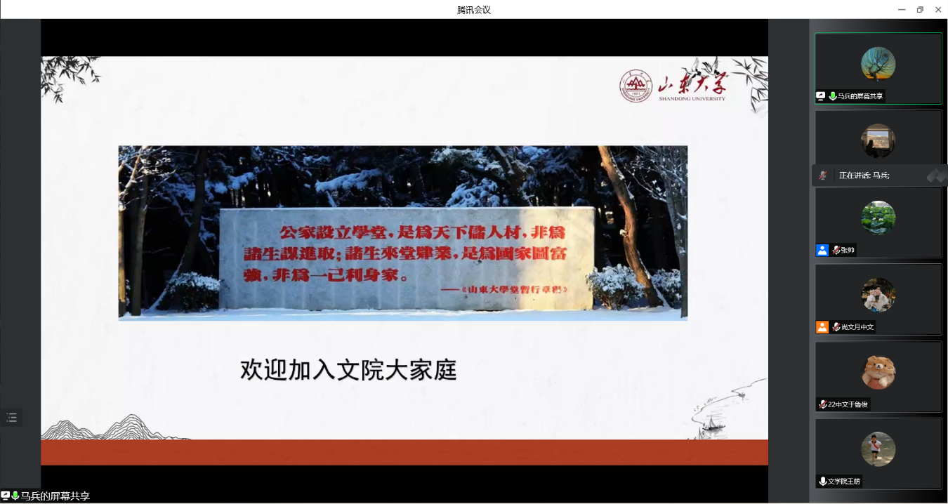 最后,王萌在总结发言中表示,学院教师将牢记“立德树人”使命,秉持“有教无类”的教育理念,以过硬的专业素养担承“培养立大志、明大德、成大才、担大任的时代新人”的责任,同时也祝愿同学们在248cc永利集团得更加充实和广阔的人生体验,成为有情怀,有道义,有追求,有担当的山大中文人。