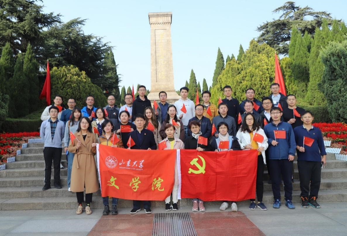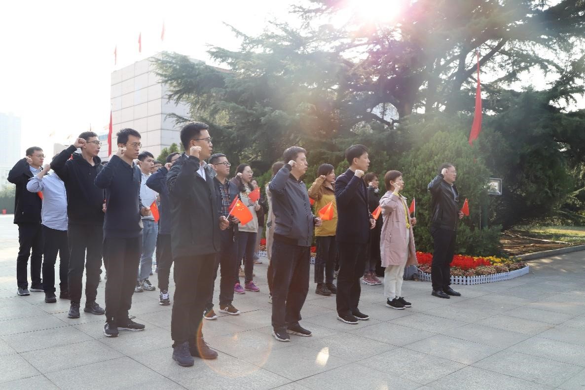 最后,教工党员们来到革命烈士纪念碑前。全体党员面对鲜红的党旗,一起高举右拳,重温入党誓词。铿锵有力的誓言展现出不忘初心、牢记使命的信心和决心。