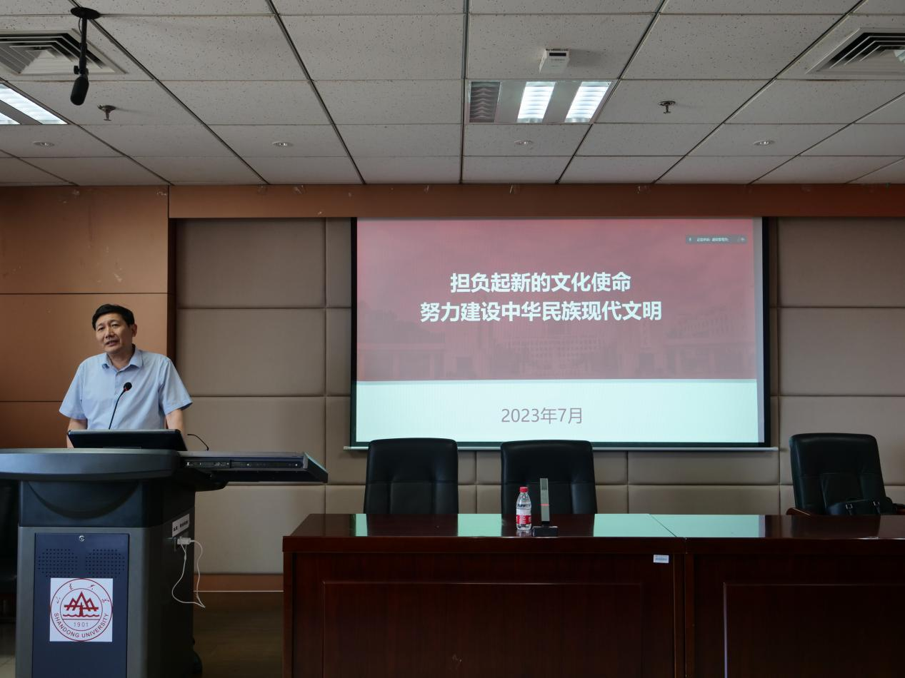 随后,杜泽逊结合习近平总书记在文化传承发展座谈会中的重要讲话内容讲授主题党课。国家之魂,文以化之,文以铸之,杜泽逊表示,习近平总书记的重要讲话为继续推进文化传承发展和繁荣兴盛指明了前进方向。杜泽逊认为,要珍惜运用中华优秀传统文化,坚定文化自信、坚持守正创新,同时还应有对世界文明兼收并蓄的开放胸怀。面对历史典籍,一方面要做好典籍版本的整理与保护,一方面要深入挖掘其宝贵的文化内涵,让中华优秀传统文化焕发新的活力与光彩。他鼓励全体教职工担负起新的文化使命,努力建设中华民族现代文明,深刻理解、不断推进“第二个结合”。