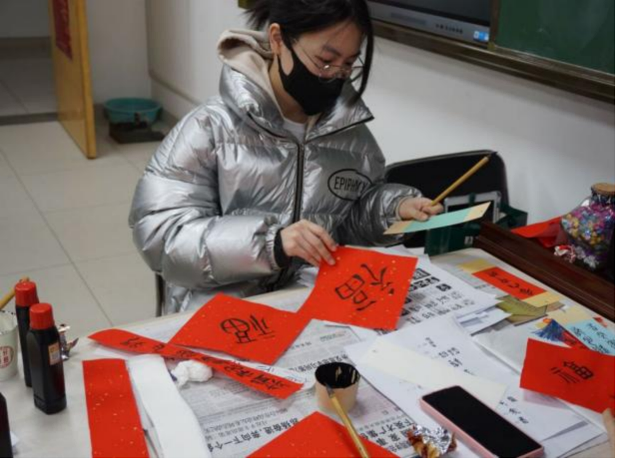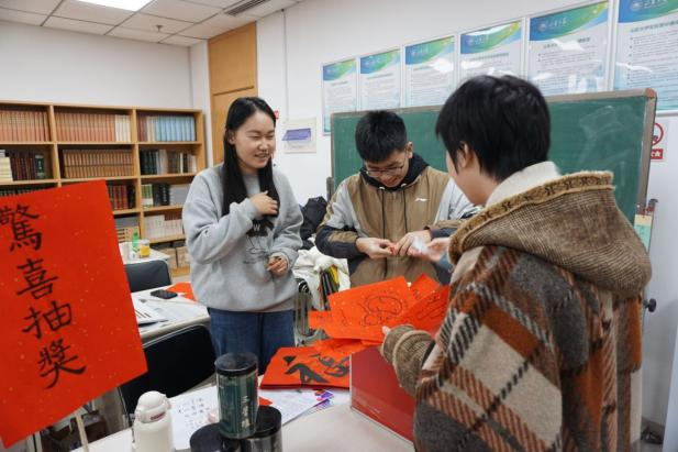 “桃符呵笔写,椒酒过花斜。”21级古文字强基班李书玉同学表示,“在2024年的第一天用古文字写箴言吉语和福字,似乎触摸到了千年前古人的一点芳踪。有些期许是时间无法磨灭的,而且能够穿过历史的长河,持续触动人的心弦。”口腔医学院22级口本硕班陈佳颖同学,非常开心抽中以“龋”字甲骨文为原型的文创贴纸:“贴纸上画着牙齿间有一条虫,经过老师讲解,得知这就是甲骨文中表示蛀牙的‘龋’字,可以说是专业对口了。在活动过程中自己画古文字,自己制作书签,不仅好玩,而且有意义!新的一年,以这样有趣的一个上午开始,很特殊,很值得纪念。”