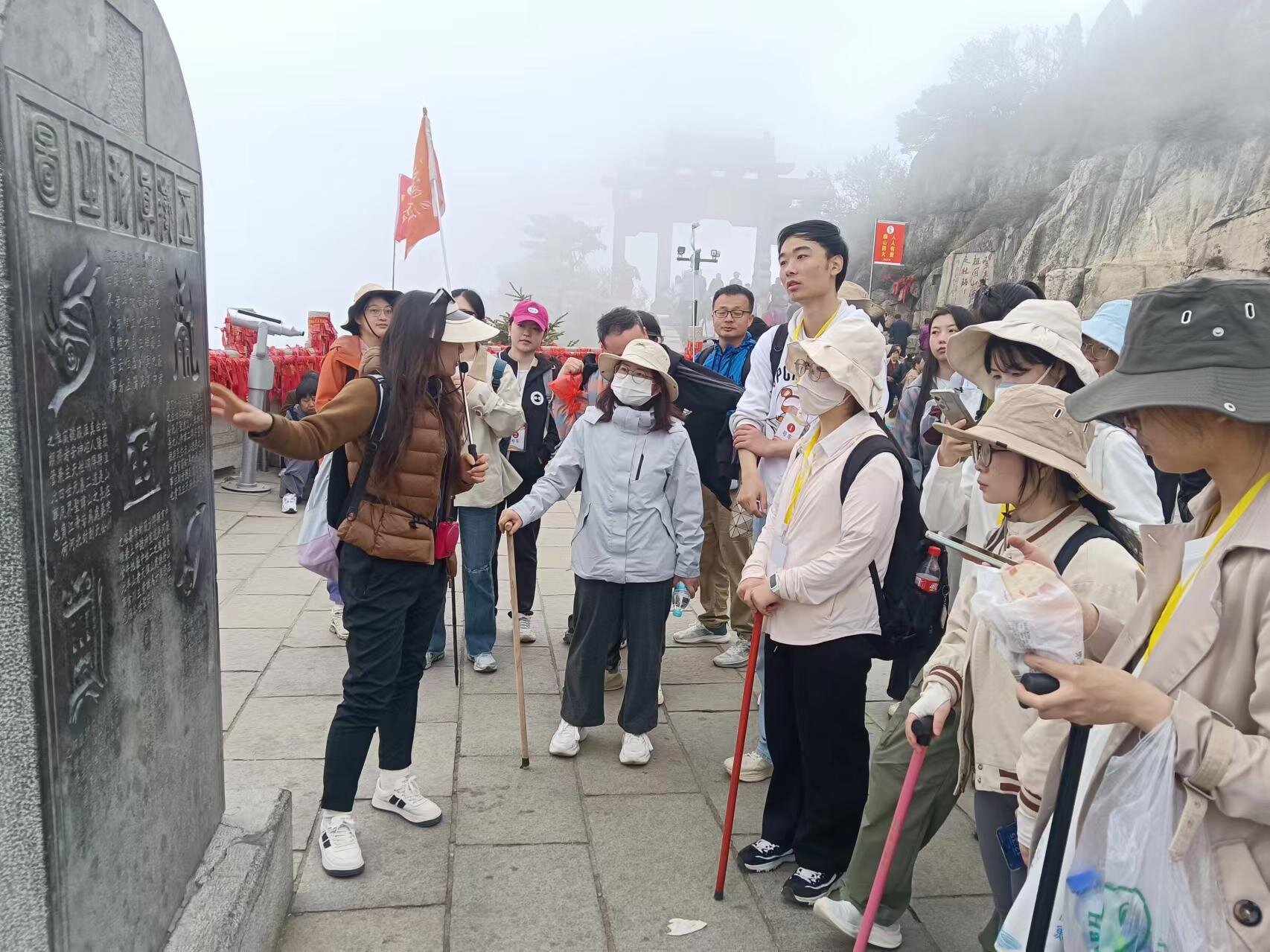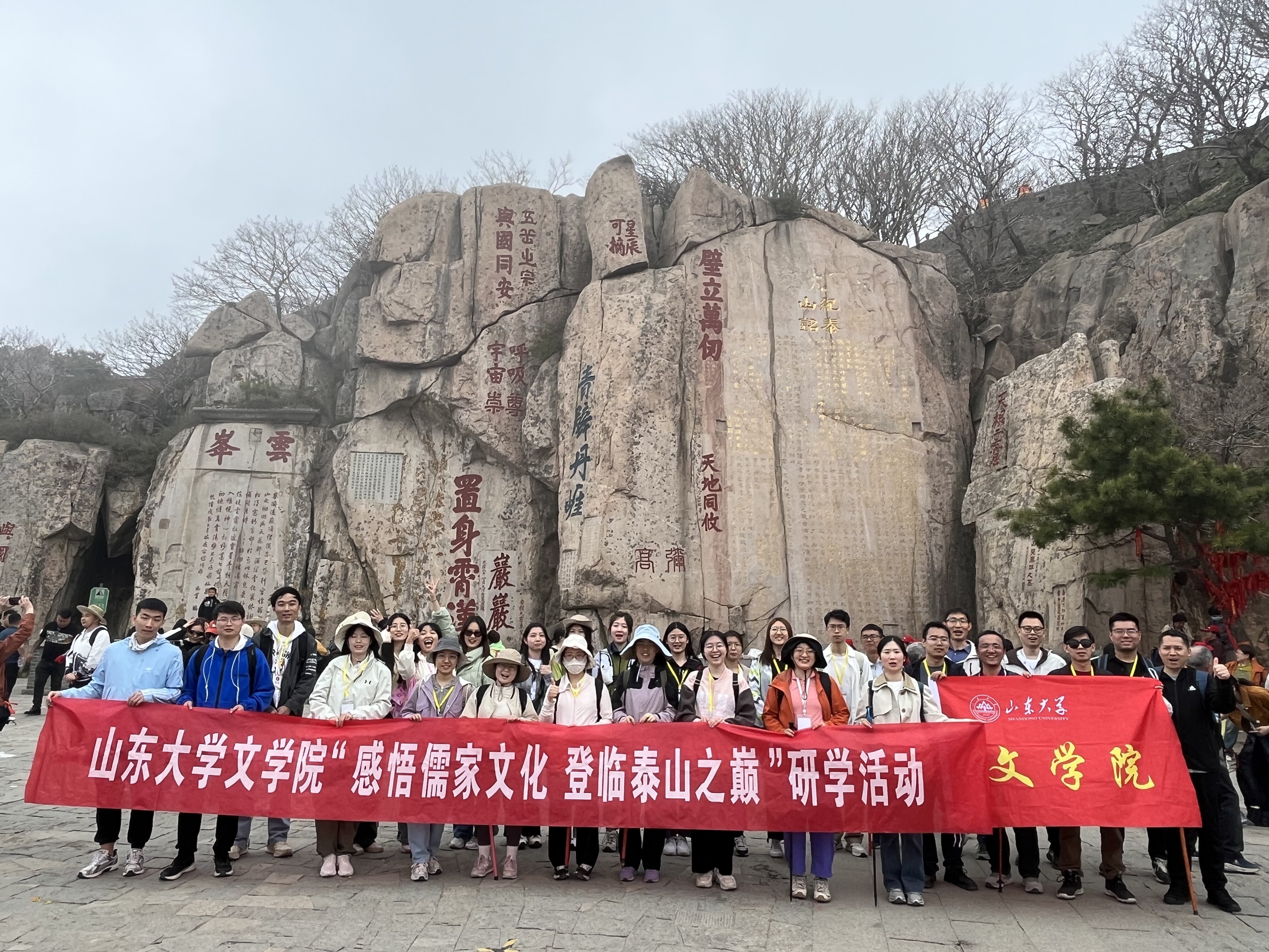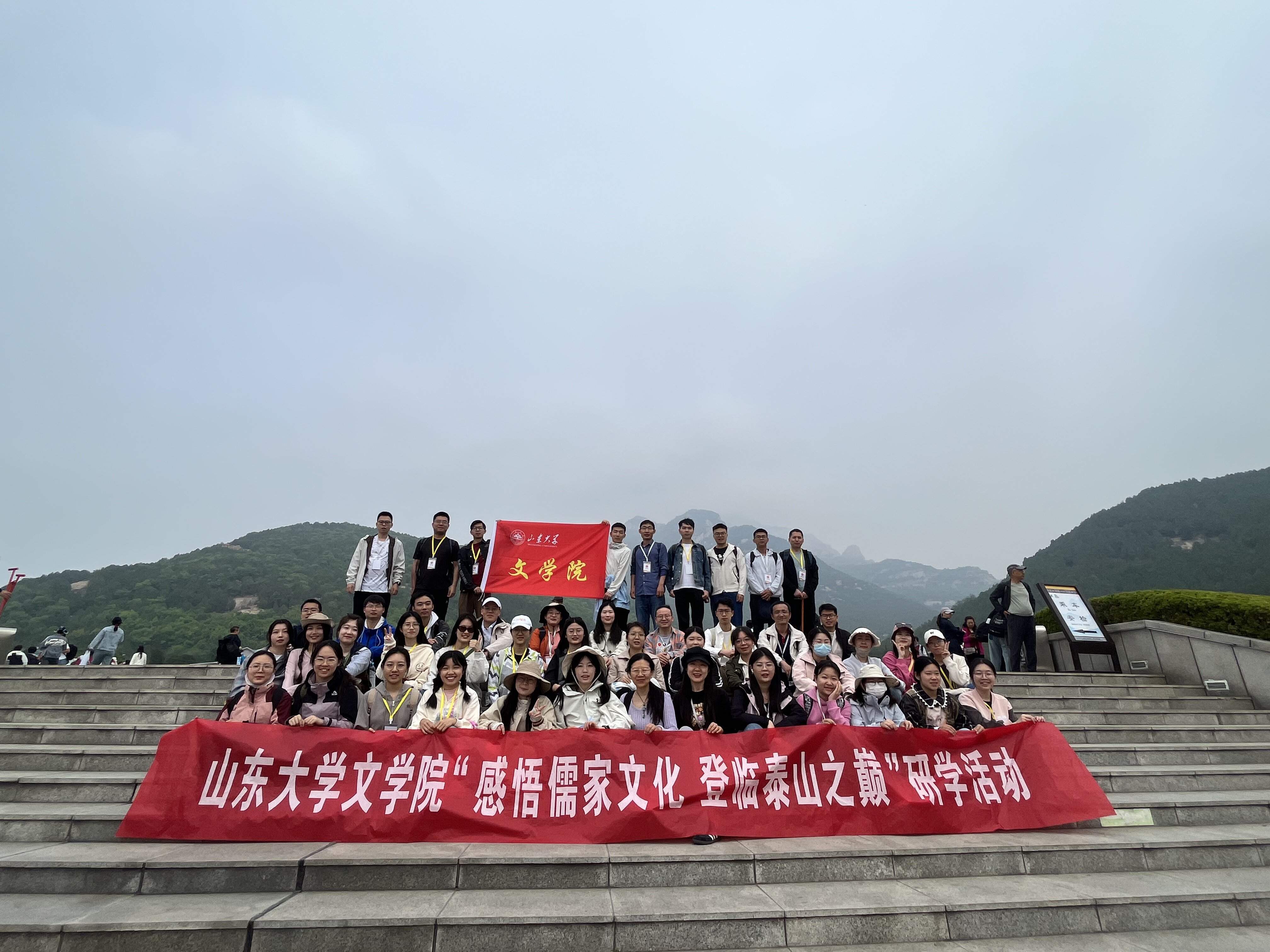 21日上午,研学团队乘车至泰山中天门,开始自由攀登。毕业将至,登山之旅是同学们既往三年求学之路的缩影,也是对未来诸多发展可能性的预演。中天门至南天门之间,当属“十八盘”最为险峭,老师、同学们至此无不攥紧扶栏,侧足而上。南天门上,已在青霭白云之间。有同学奋力冲顶,心系玉皇山巅,有同学悠游缓步,感受雨雾沾衣。师生众人一路上遥观山间石刻,在前人翰墨前驻足流连,于俯仰之间发现历史、感悟哲思并反身自省。