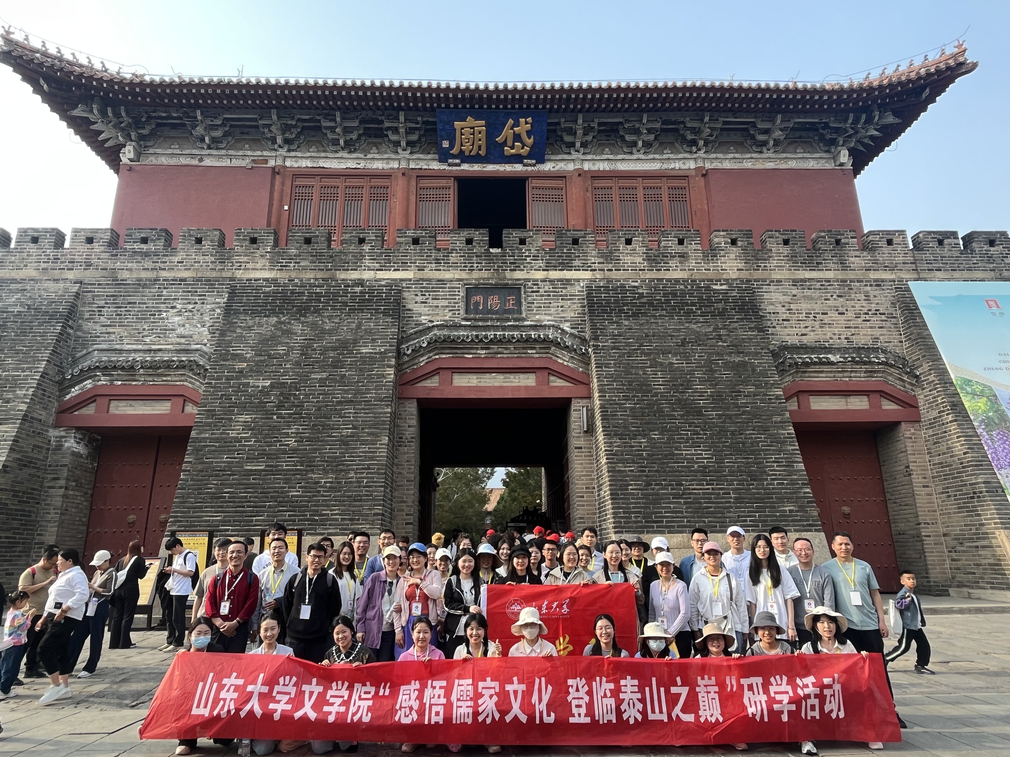 20日下午,研学团队抵达泰安岱庙。岱庙俗称“东岳庙”,是中国古代帝王供奉泰山神灵,举行祭祀大典的场所,堪称泰山历史文化的缩影。岱庙保存了自秦汉以来的历代碑碣石刻与古树名木,数量之多、品类之盛非别处庙宇可以媲美,因此历史底蕴与文化积淀极其深厚。研学团队在“秦泰山刻石”碑前驻足观赏,文字学专业的老师为同学们悉心讲述刻石文的悠久历史,在场学子对这流传千年而不朽的文化胜景莫不交口称赞。