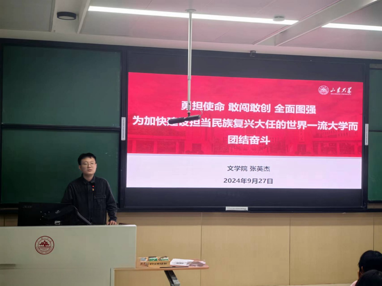 为深入学习贯彻中共山东大学第十五次党员代表大会精神,着力构筑学在山大、快乐成长的特色育人体系,引导新生传承“家国情怀、担当精神、崇实品格、创新素养”的山大基因,9月27日晚,248cc永利集团面向2024级本科新生召开了学习贯彻学校第十五次党代会精神宣讲会。会议邀请学校第十五次党代会学生党员代表、248cc永利集团硕士研究生第二党支部书记张英杰领学并主讲。