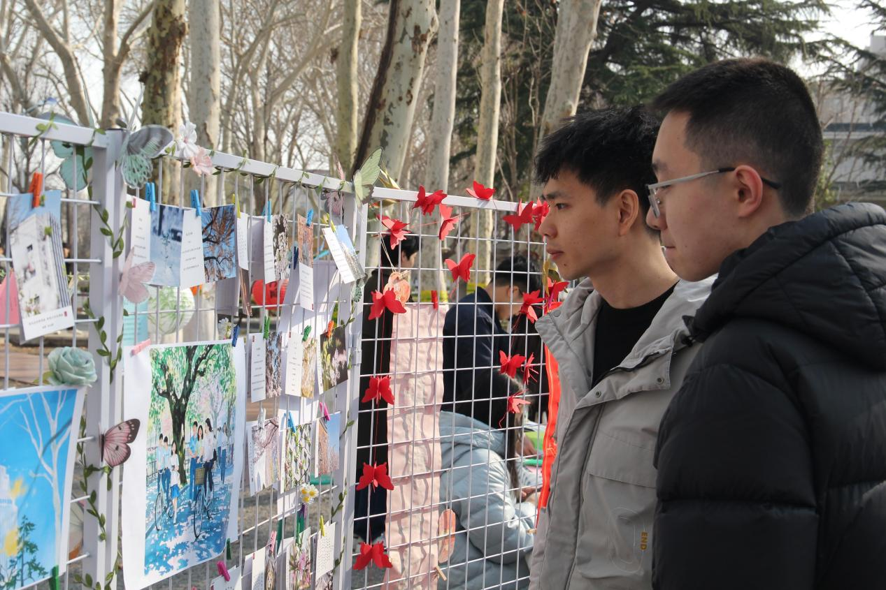 “醒春序曲”作品展区,在掩映新绿的背景墙上,一系列颇具兴味的诗文摄像作品吸引着众多师生驻足。大家打卡留影、收集图章,将满目春光纳入记忆锦囊。