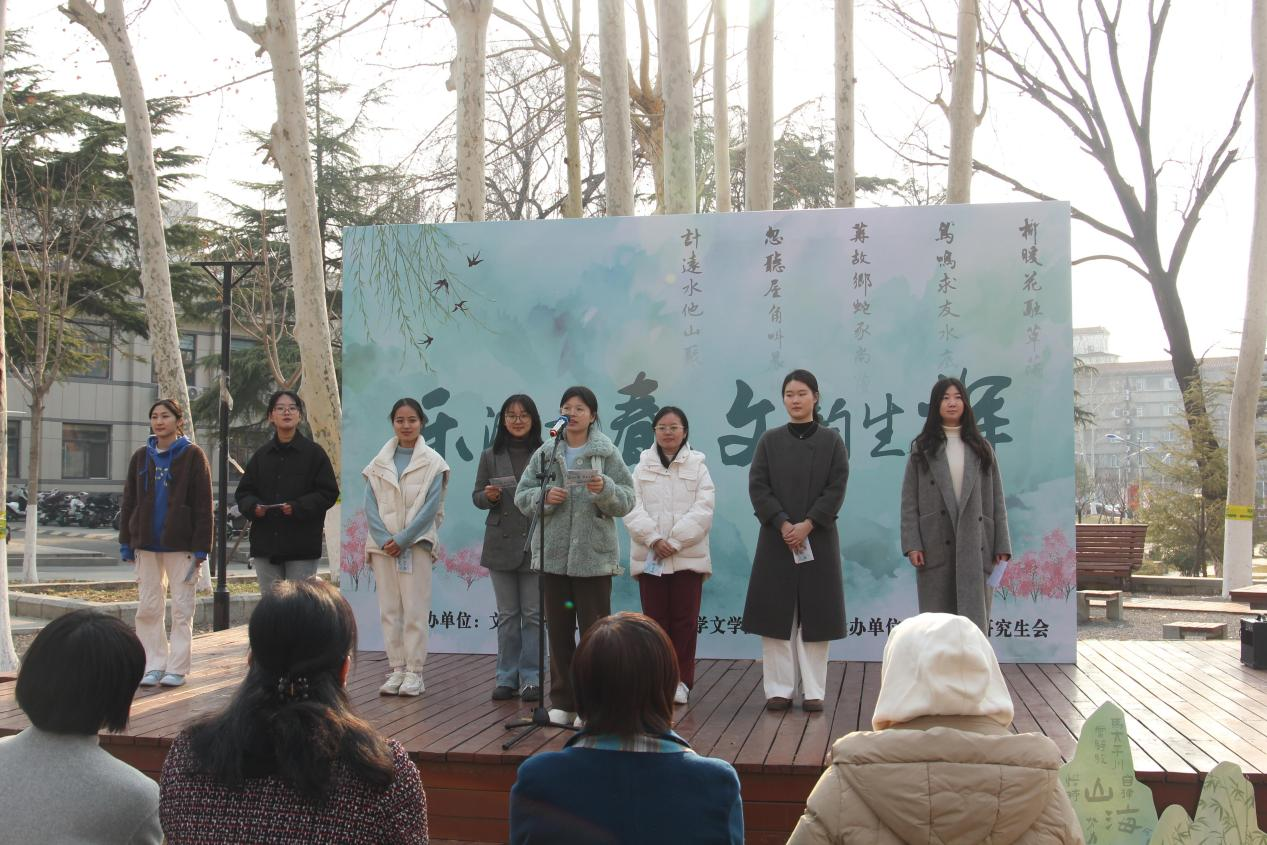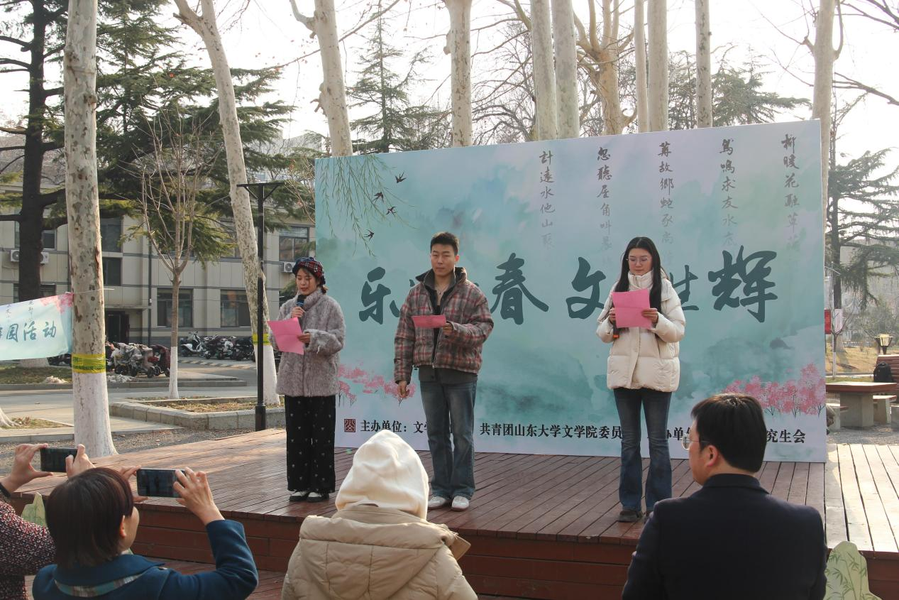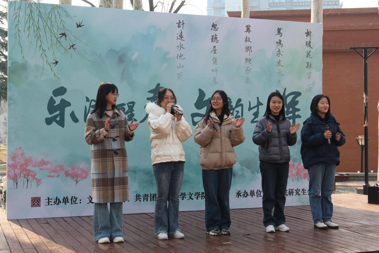 下午三时,备受期待的“闹春诗韵”诗词吟诵打卡环节在热烈的氛围中开始,各类精彩节目轮番登台,亮点纷呈。院研究生会实践部成员演唱一首《遇见你的时候所有星星都落在我头上》,拉开活动序幕。紧接着,各个节目在暖阳斜照中渐入佳境:教师郭春晓、沈文、杨海燕、栾妮、刘占召、朱家英、果娜、吉顒带来《古诗组诗》《春江花月夜》朗诵;教师张燕芬别出心裁,分别用粤语和普通话吟诵《一剪梅》《如梦令》;教师孙雅乔、宋海涛、孙铭孺带来诗歌朗诵《我们是青年》;教师万佳俊、王涵、寇鑫分别以歌唱、英语和普通话的朗诵方式演绎了春日《第一篇章》;教师吉顒、郑婷婷、田玉洁、侯静、房言言、张洁、侯星星配合默契,带来《第二篇章》;《第三篇章》则由学生诗词爱好者演绎,朗诵声久久回响。接着,教师张洁以美声唱法演绎了《军营里飞来一只百灵鸟》;山东大学学生演讲协会成员创造性融合现代舞和情景朗诵,呈现一曲《浴风春舞》;山东大学学生相声协会成员以快板《哪吒闹海》点燃全场;研究生王少宇、牛洪照带来的戏曲节目《沙家浜·智斗》重现经典。师生们或唱或演,将传统文化与现代艺术完美交织,赢得现场阵阵掌声与喝彩,将活动的氛围推向高潮。