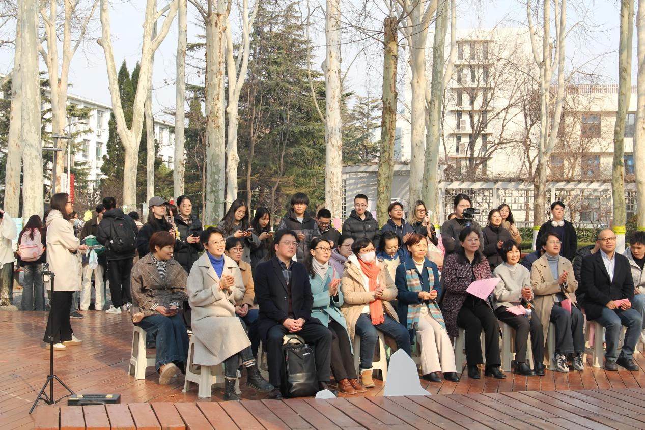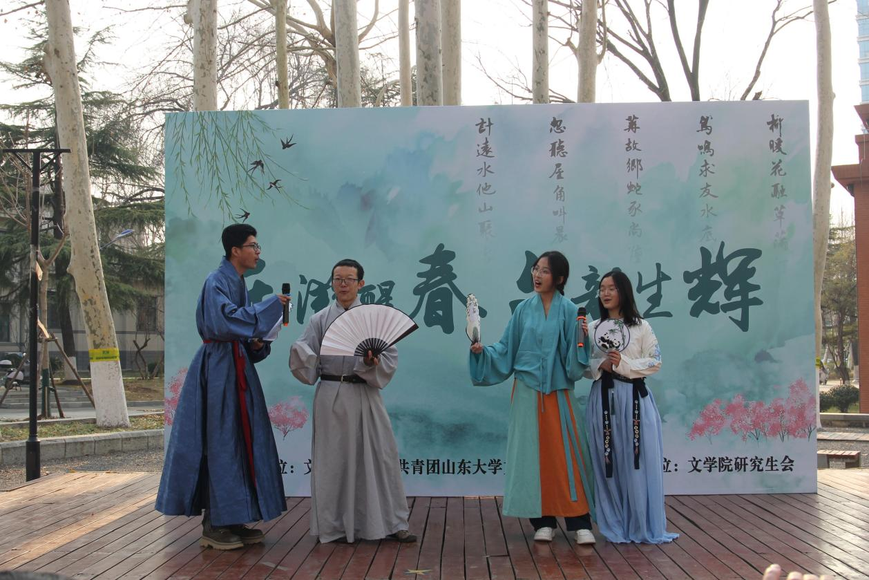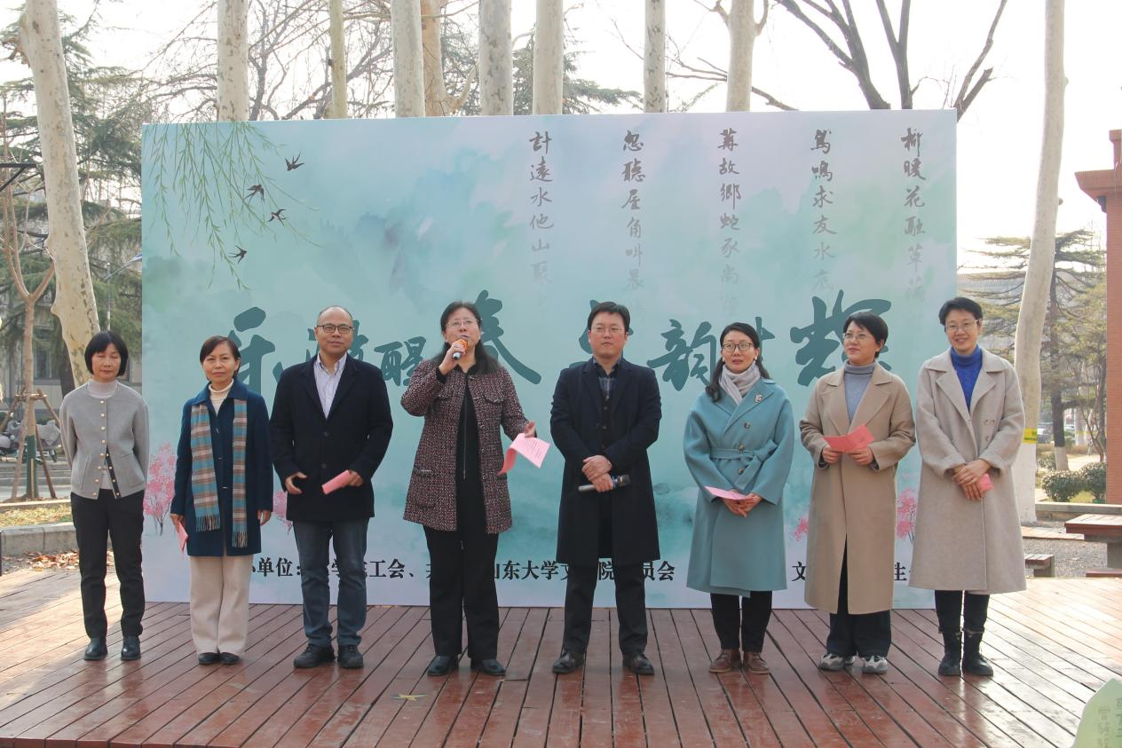 下午三时,备受期待的“闹春诗韵”诗词吟诵打卡环节在热烈的氛围中开始,各类精彩节目轮番登台,亮点纷呈。院研究生会实践部成员演唱一首《遇见你的时候所有星星都落在我头上》,拉开活动序幕。紧接着,各个节目在暖阳斜照中渐入佳境:教师郭春晓、沈文、杨海燕、栾妮、刘占召、朱家英、果娜、吉顒带来《古诗组诗》《春江花月夜》朗诵;教师张燕芬别出心裁,分别用粤语和普通话吟诵《一剪梅》《如梦令》;教师孙雅乔、宋海涛、孙铭孺带来诗歌朗诵《我们是青年》;教师万佳俊、王涵、寇鑫分别以歌唱、英语和普通话的朗诵方式演绎了春日《第一篇章》;教师吉顒、郑婷婷、田玉洁、侯静、房言言、张洁、侯星星配合默契,带来《第二篇章》;《第三篇章》则由学生诗词爱好者演绎,朗诵声久久回响。接着,教师张洁以美声唱法演绎了《军营里飞来一只百灵鸟》;山东大学学生演讲协会成员创造性融合现代舞和情景朗诵,呈现一曲《浴风春舞》;山东大学学生相声协会成员以快板《哪吒闹海》点燃全场;研究生王少宇、牛洪照带来的戏曲节目《沙家浜·智斗》重现经典。师生们或唱或演,将传统文化与现代艺术完美交织,赢得现场阵阵掌声与喝彩,将活动的氛围推向高潮。