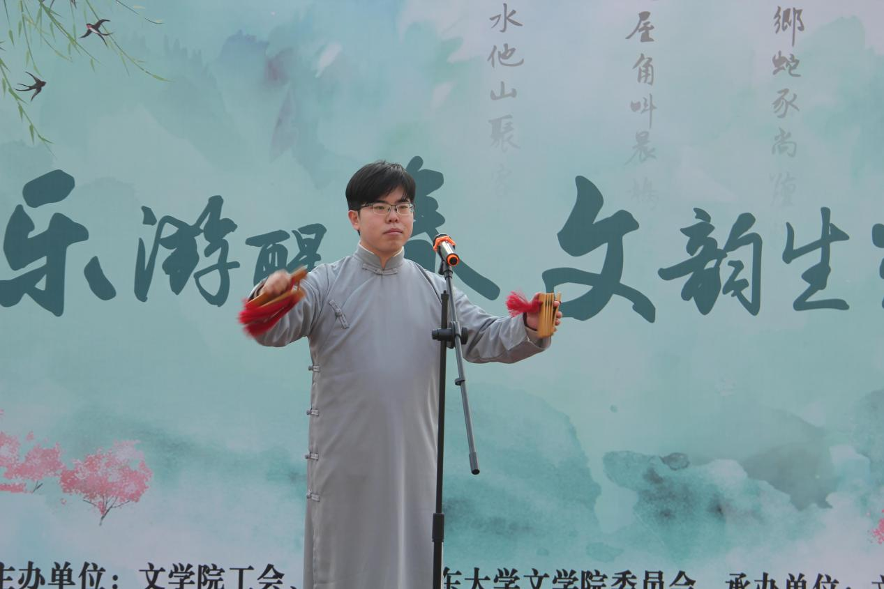 此外,现场还有来自校党委宣传部、校图书馆、数学学院、管理学院、经济学院、护理与康复学院、化学与化工学院等多个机关或学院的教师同学上台吟诵春日诗词,为这场春日雅集增添了更多的诗意,让师生们沉浸其中,流连忘返。校党委宣传部教师贾富康表示,在校园里邂逅这样一场充满诗意与文化气息的活动是一种美好的缘分,登台朗诵古诗词的经历更让她切身感受到了传统文化的深厚底蕴和独特魅力;哲学与社会发展学院2024级本科生洪泽宣则感慨,粤语版《一剪梅》让他听到了熟悉的乡音而倍感亲切,希望未来能有更多这样的活动,让大家在校园里也能感受到家乡文化的魅力。