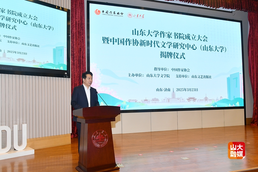 3月23日,山东大学作家书院成立大会暨中国作家协会新时代文学研究中心(山东大学)揭牌仪式在中心校区举行。中国作家协会党组成员、副主席、书记处书记吴义勤,校长、中国工程院院士李术才,全国新文科教育研究中心主任、教育部新文科建设工作组组长樊丽明出席仪式。著名作家、上海市作家协会主席孙甘露,山东省作协党组书记、副主席赵艺丁,中国作协原书记处书记施战军参加活动。