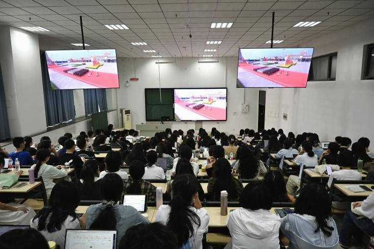 9月3日,纪念中国人民抗日战争暨世界反法西斯战争胜利80周年大会在北京天安门广场隆重举行。248cc永利集团师生500余人通过电视直播观看大会盛况,认真学习习近平总书记重要讲话精神,反响热烈、氛围浓厚。