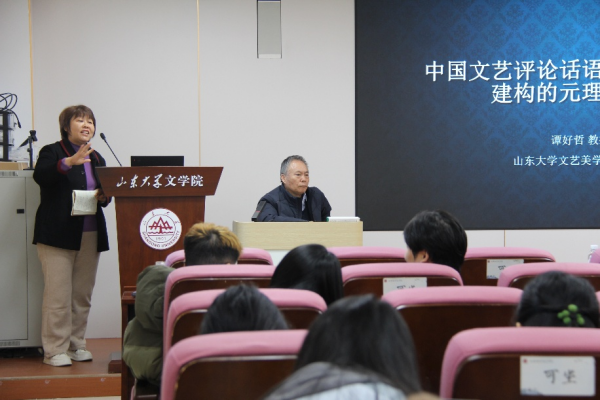 11月18日上午9时,山东大学文艺美学研究中心主任谭好哲教授做客“当代美学前沿:东方与西方”国际学术研习营,于知新楼A620室作了题为“中国文艺评论话语自主知识体系建构的元理论思考”的学术讲座。讲座由文艺美学研究中心孙丽君教授主持,德国卡塞尔大学艺术史与美学系王卓斐副教授、文艺美学研究中心杨建刚教授和韩清玉教授出席,来自校内外数十所高校的一百余名硕博士研究生现场聆听。