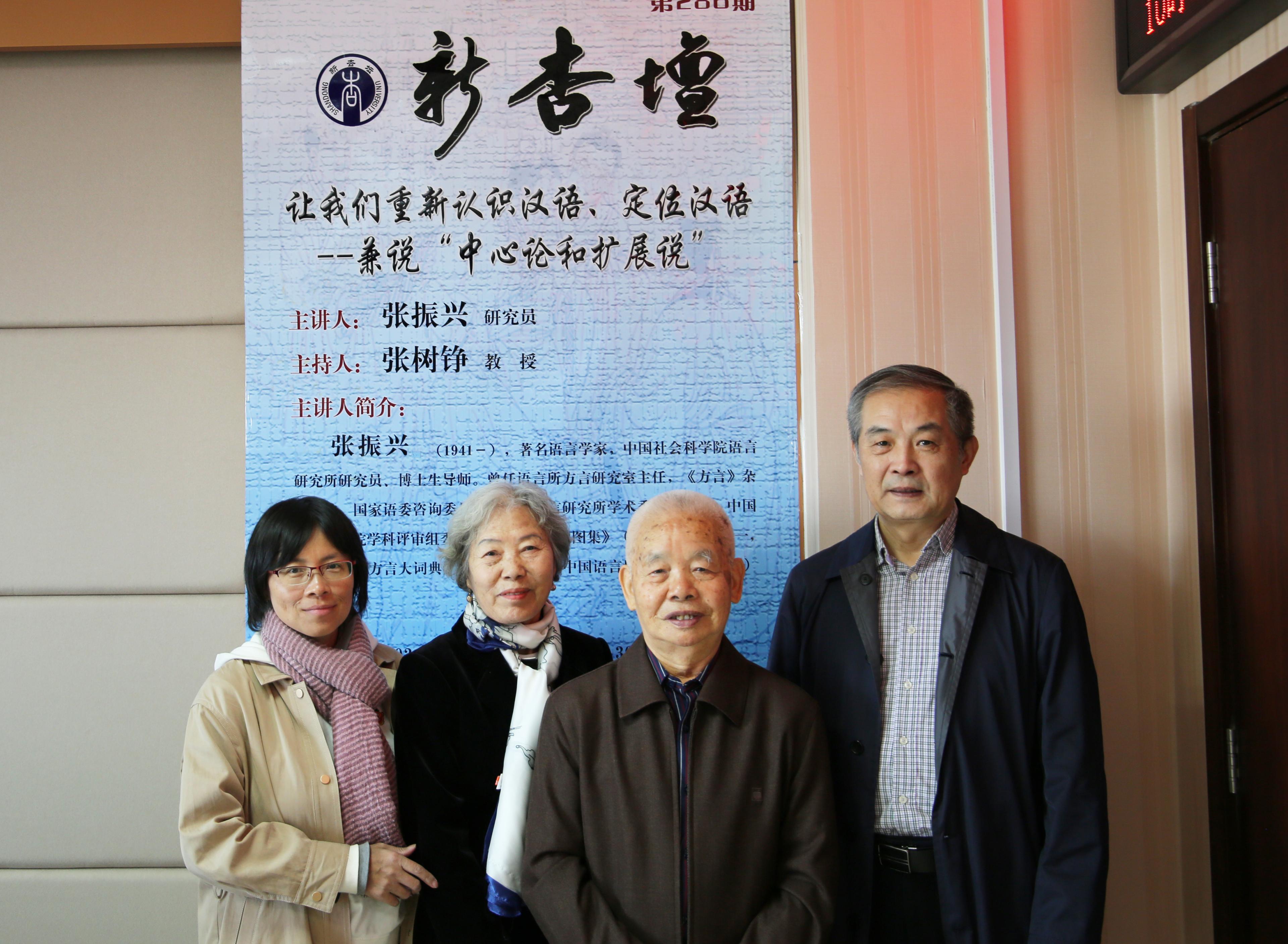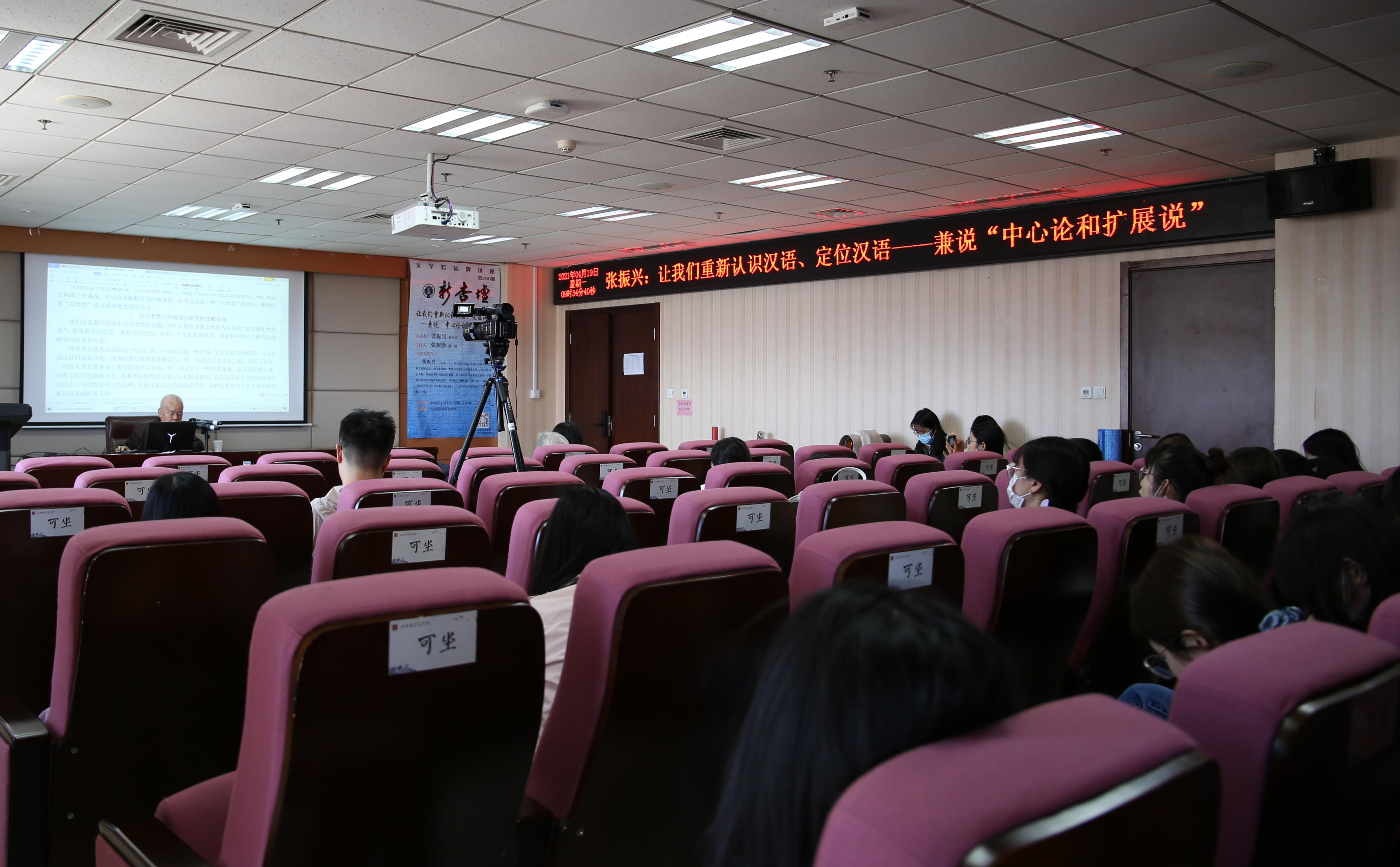 4月19日8:30,著名语言学家、中国社会科学院语言研究所研究员、《方言》杂志原主编张振兴先生做客“新杏坛”,在知新楼A620作题为“让我们重新认识汉语、定位汉语——兼说‘中心论和扩展说’”的讲座。讲座由张树铮教授主持,张惠英教授、张燕芬副教授参与,文学院众多师生共同聆听了本场讲座。