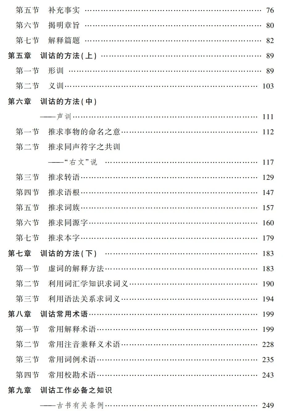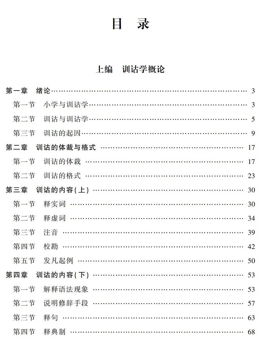 本书特设“训诂的方法”上、中、下三章介绍训诂亦即释词的规律,其“常用训诂术语”一章,全面地介绍了长期积累下来各式训诂术语的含义和用途。“训诂工作必备之知识"一章专门介绍对训诂工作很重要而其他书籍一般又介绍不到的古人遣词造句的一般规律,即古书词例、文例、错讹条例等知识,这既为训诂的教学和运用提供了便利,也节省了不少翻阅、检查的辛劳。而本书下编“训诂学发展简史”于训诂学的产生和发展作了多方面的探讨,阐述了各时期其他学科所给的影响,并且全面系统地介绍了各个发展时期各类训诂书的基本情况和知识,这一方面深入地显示了训诂学之发展规律,一方面也切实地提示了训诂的方法与条例,对训诂理论和技能的培养都是很重要的。