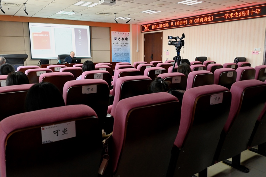 2024年3月27日下午2时,华东师范大学终身教授、中国英汉语比较研究会名誉会长潘文国教授做客第360期“新杏坛”,于知新楼A620室作了题为“从《韵图考》到《经典通诠》——学术生涯四十年”的学术讲座。讲座由张树铮教授主持,文学院党委书记郭春晓等出席,吸引了众多师生前来聆听。