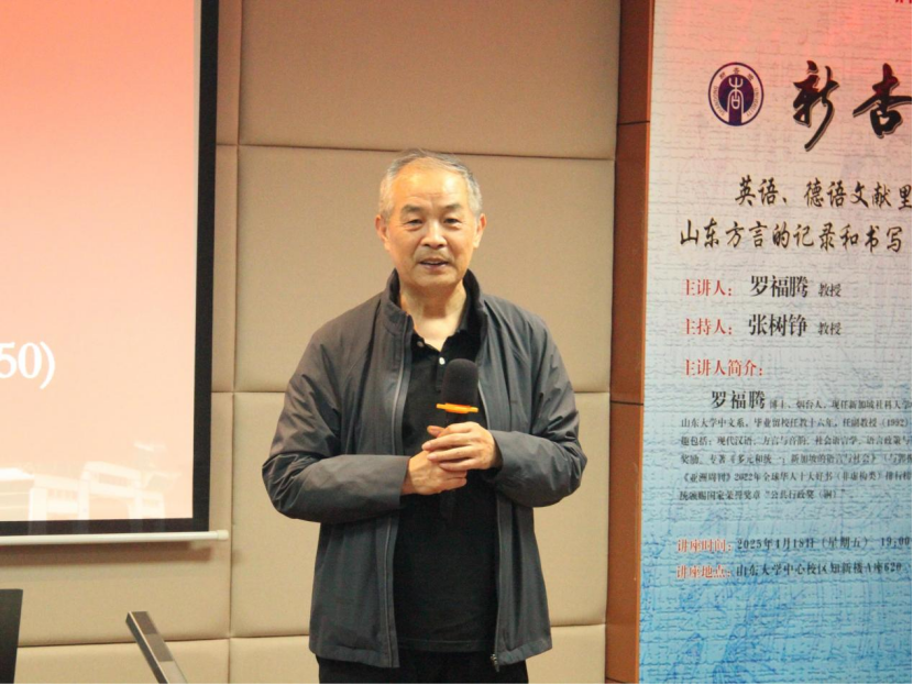 4月18日19时,新加坡社科大学中文系罗福腾教授做客第405期“新杏坛”,于知新楼A620作题为“英语、德语文献里有关山东方言的记录和书写(1860-1950)”的学术讲座。讲座由张树铮教授主持,文学院岳立静教授、刘晓艺教授、黄维军副研究员,国际教育学院许培新副教授、山东师范大学王红娟副教授等参加,吸引了校内外诸多师生前来聆听。