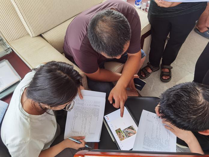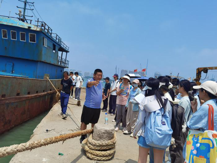 7月10日,调研重点转向当地的渔业词汇调查。团队前往海阳市龙山街道新民村,聚焦干海鲜、活海产、船体部位、捕鱼活动、渔业文化等五类词汇条目,分组采访新民村、徐家铺村以及麻姑岛村的船长和老渔民,并做了详细的记录。随后,同学们又赶往凤城街道海阳港码头,实地采访了年轻船长,深入了解了海阳捕捞业的历史和现代渔业经济的发展。同学们在记录方言文化、收获大量第一手渔业词汇材料的同时,也追踪到其中承载的渔业文化和历史,收获很大。
