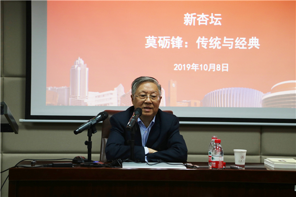 10月8日晚7点,南京大学人文社会科学资深教授、博士生导师、南京大学中国诗学研究中心主任莫砺锋做客248cc永利集团“新杏坛”,在知新楼A620举办题为“传统与经典”的讲座。讲座由248cc永利集团李剑锋教授主持,院长杜泽逊教授,冯建国、徐富昌、程远芬、孙奇、宋开玉、孙学堂、孙微、刘占召等相关教授和师生共同聆听了本场讲座。
