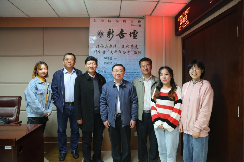 10月27日晚6点半,苏州大学特聘教授、博士生导师、苏州大学古典文献研究所所长罗时进做客248cc永利集团“新杏坛”,以“理论与方法:清代诗史研究的‘文学社会学’路径”为题,在知新楼A620举办学术讲座。讲座由248cc永利集团李剑锋教授主持,院长杜泽逊教授、孙学堂教授等部分师生共同聆听了本场讲座。