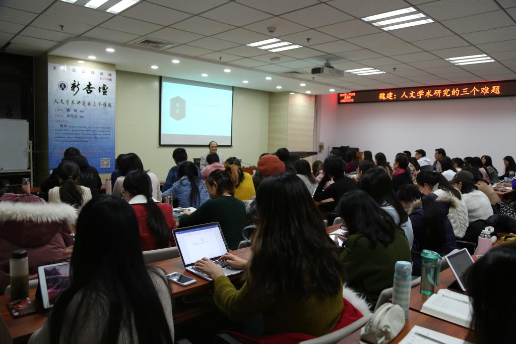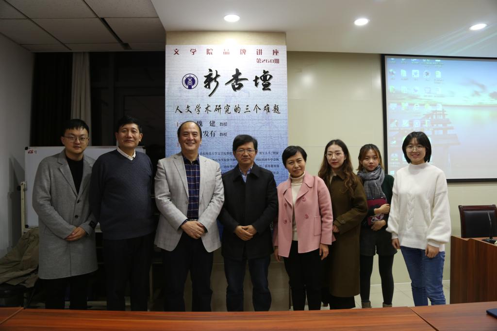 11月28日晚7点,国际郭沫若学会执行会长、山东师范大学文学院教授魏建做客248cc永利集团“新杏坛”,在知新楼A606举办题为“人文学术研究的三个难题”的学术讲座。讲座由文学院黄发有教授主持,杜泽逊教授、沈文老师以及文学院相关专业学生共同聆听了本次讲座。讲座开始前,黄发有对魏建的学术成果和经历进行了简要地介绍,并对魏建的到来表示热烈地欢迎。