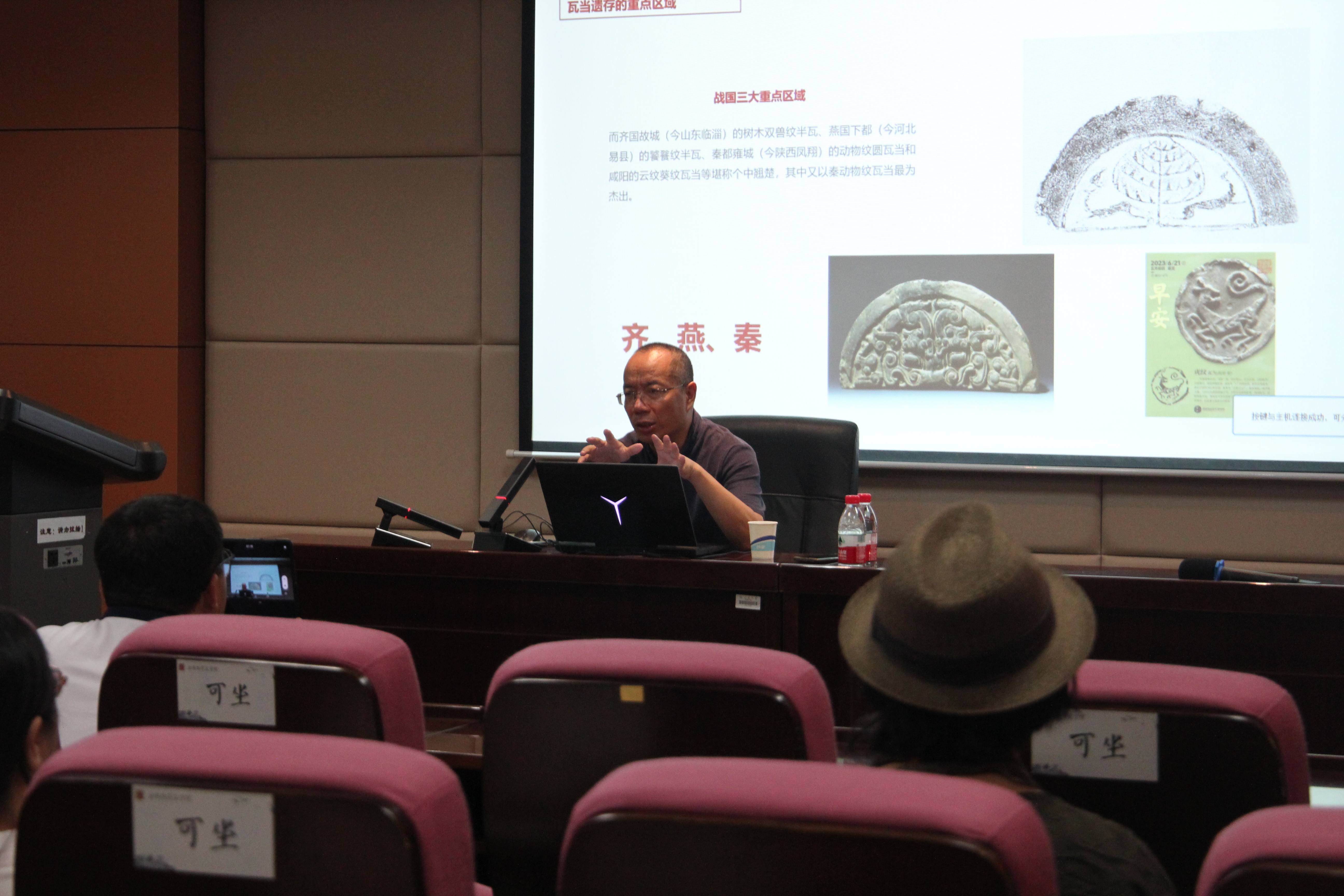 之后,陈根远研究员介绍瓦当的出现,战国时期的瓦当以及西汉的瓦当三部分内容。根据现有的考古发现,应该早在龙山早期(距今4500-4300年),中国就出现了瓦当,西周周原瓦当已经成熟。战国时期有秦、齐、燕三大主流瓦当系统,是中国古代瓦当的第一个高峰,主要是图像瓦当和图案瓦当两类。秦瓦以形状分大致有半圆瓦当、大半圆瓦当和圆瓦当三类,最著名的是动物纹瓦当,还有葵纹瓦当和云纹瓦当。齐瓦的主要母题是树木纹,燕瓦主要是饕餮纹半瓦。以文字瓦当的出现为标志,西汉是中国古代瓦当的第二个高峰。西汉的文字瓦当以吉语为主,多为四字;图像瓦当中,四神瓦当一枝独秀;图案瓦当以各式云纹为主,已不多见。进而陈根远研究员继续讲解“蕲年宫当”“橐泉宫当”“上林”瓦当等具体的宫苑瓦当,“佐弋”官署瓦当和“长乐未央”“与天无极”“千秋万岁”等吉语瓦当。还介绍到吉语瓦当中比较独特的两类,一是文辞采用汉赋的瓦当,二是备受金石家重视的十二字瓦当。