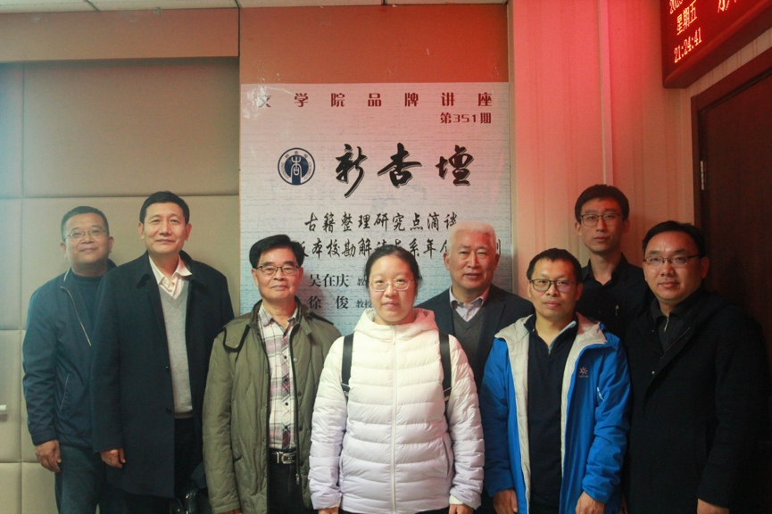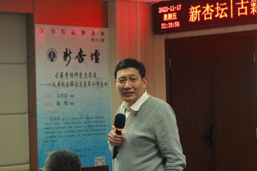 11月17日晚19时,厦门大学中文系教授、博士生导师、中国唐代文学学会理事吴在庆教授做客第351期“新杏坛”,于知新楼A620室作学术讲座,题为“古籍整理研究点滴谈——以版本校勘解读与系年个案为例”。讲座由徐俊教授主持,文学院杜泽逊院长,孙学堂教授,高新华副教授,徐昌盛副教授,张倩倩老师,赵鑫老师出席,吸引了数百名师生前来聆听。