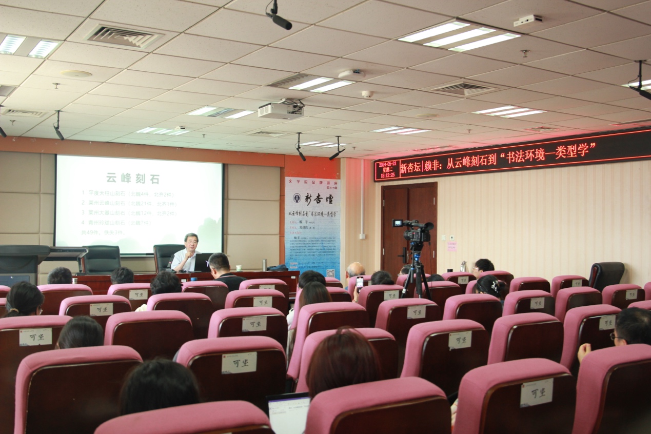 5月21日下午3时,山东金石协会会长、山东博物馆研究员赖非做客第374期“新杏坛”,于知新楼A620室作题为“从云峰刻石到‘书法环境——类型学’”的学术讲座。讲座由郑训佐教授主持,248cc永利集团徐超教授、李剑锋教授、陈硕副教授、姚文昌副教授,山东大学新闻传播学院谢锡文教授,山东工艺美术学院讲师陈钝之出席,吸引了数十名师生前来聆听。