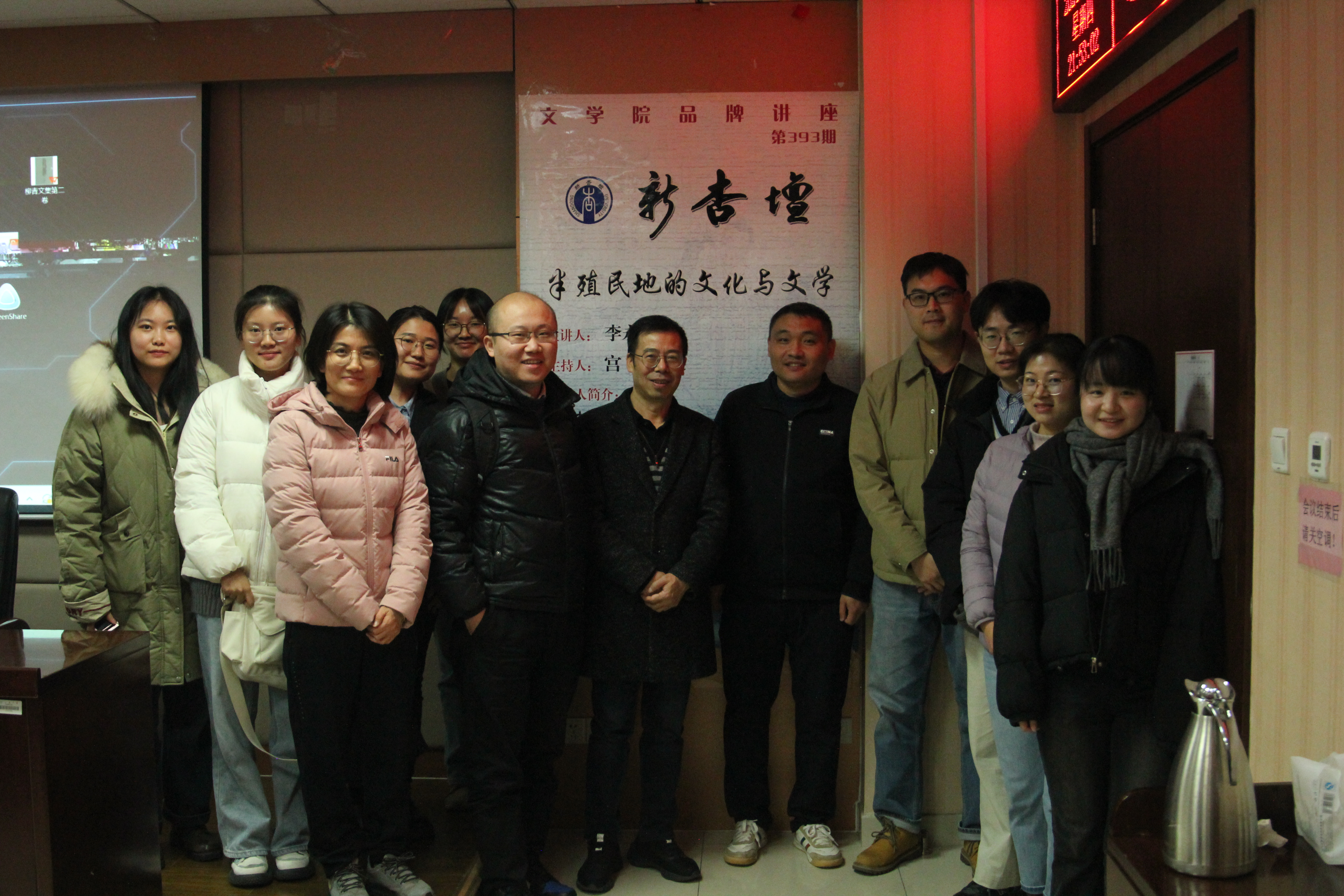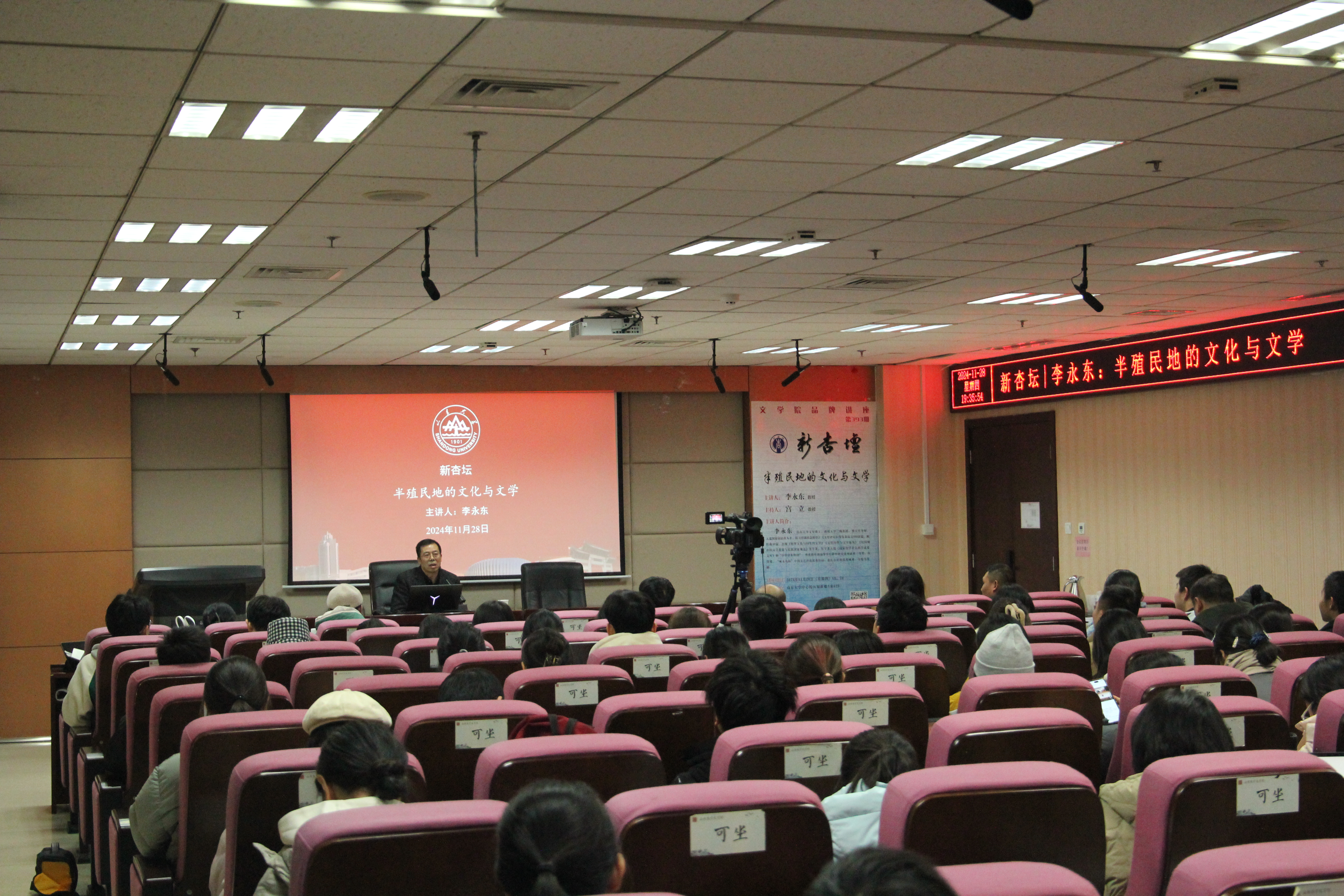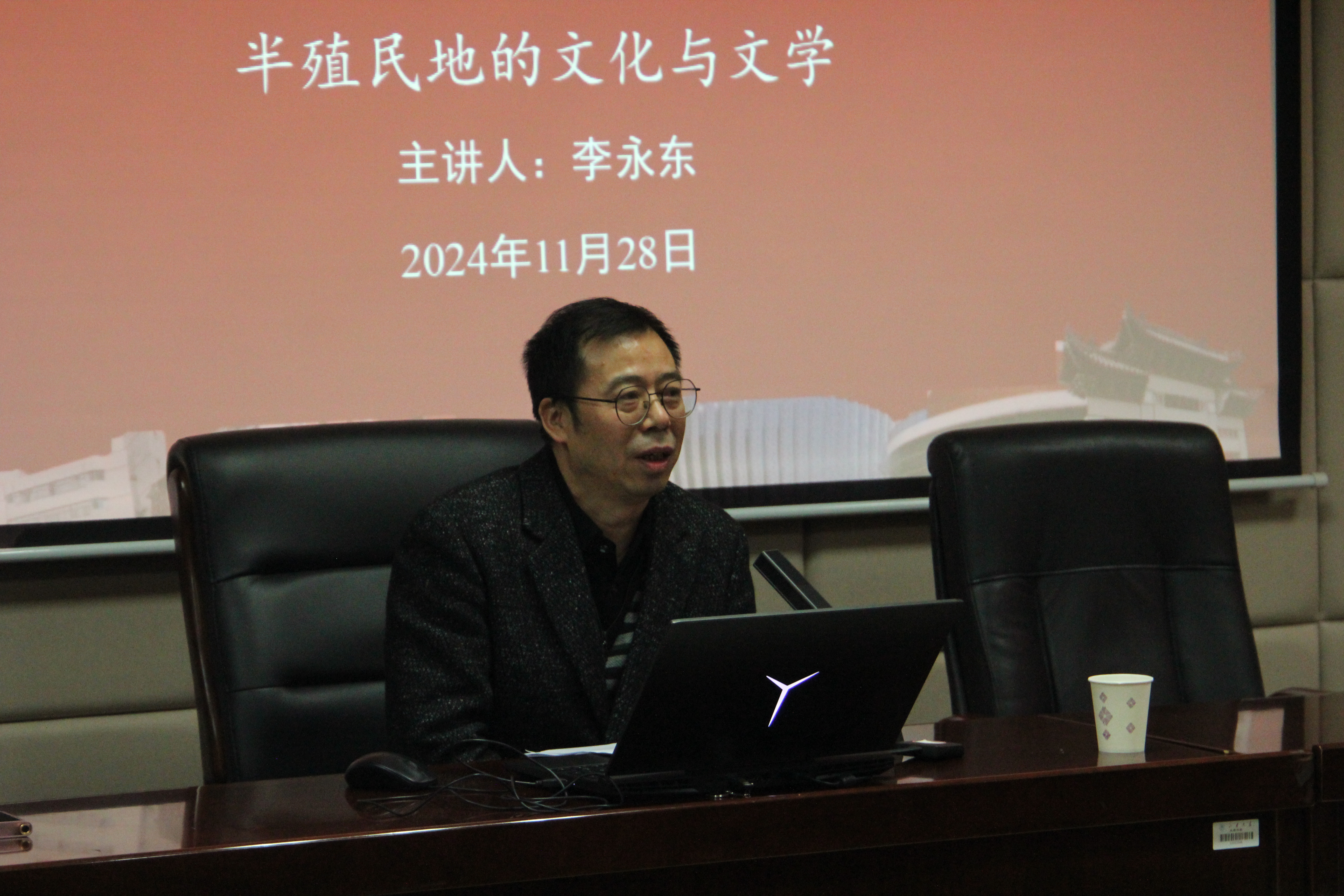 11月28日晚19时30分,西南大学文学院李永东教授做客第393期“新杏坛”,于知新楼A620室作学术讲座,题为“半殖民地的文化与文学”。讲座由248cc永利集团宫立教授主持,尹林教授、宋夜雨研究员、何瑛副教授、《山东师范大学学报(社会科学版)》编辑部谢慧聪老师等出席,吸引了校内外数十名师生前来聆听。