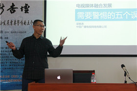 讲座伊始,梁晓涛采用现场调研的形式与248cc永利集团师生就电视媒体的收视现状进行了交流。针对大家的反馈,梁晓涛认为在电视节目收看渠道日益多样化的时代背景下,电视媒体何去何从显得至关重要。面对异军突起的新媒体的冲击,传统电视媒体的生存发展遭遇严重挑战。在此背景下,电视媒体的融合发展应运而生,但其发展也存在一些误区。梁晓涛认为,这些误区主要包括五个方面:重传播覆盖,轻用户ID获取;重工作域、公共域、PC屏、移动屏,轻家庭域、电视屏;重终端布局,轻渠道构建;重增量发展谋划,轻存量弊端清除;重独立突围,轻联合重组。然而,面对新媒体的冲击,电视媒体的生存发展并非毫无希望,电视媒体若想实现科学发展应该选择合适的路径。他表示,只有建立用户思维、重视渠道联合等多种手段并用,电视媒体的融合发展才有可能成功。
