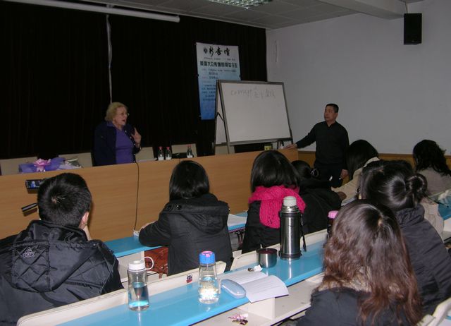 除介绍英国大众传媒的情况外,赛姆教授还向在场的同学传授如何朗读英语的技巧。她采用标点符号划分法,用敲击桌子一下的“嗒”声为单位,分为句号(5个“嗒”),冒号和分号(4个“嗒”),逗号(3个“嗒”)。她在现场亲自带领大家阅读英文文章,让同学们充分学会这种阅读的停顿和节奏。