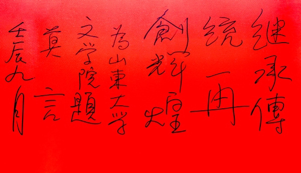 After winning the 2012 Nobel Prize in Literature, Mo Yan will leave for Sweden to accept the award. Just before his leaving, Zheng Chun, the dean of LJS, visited him with the best wishes and great congratulations from the whole Shandong University. During talking, Mo Yan was very glad to write an inscription for LJS, as the way to express his wish and expect.