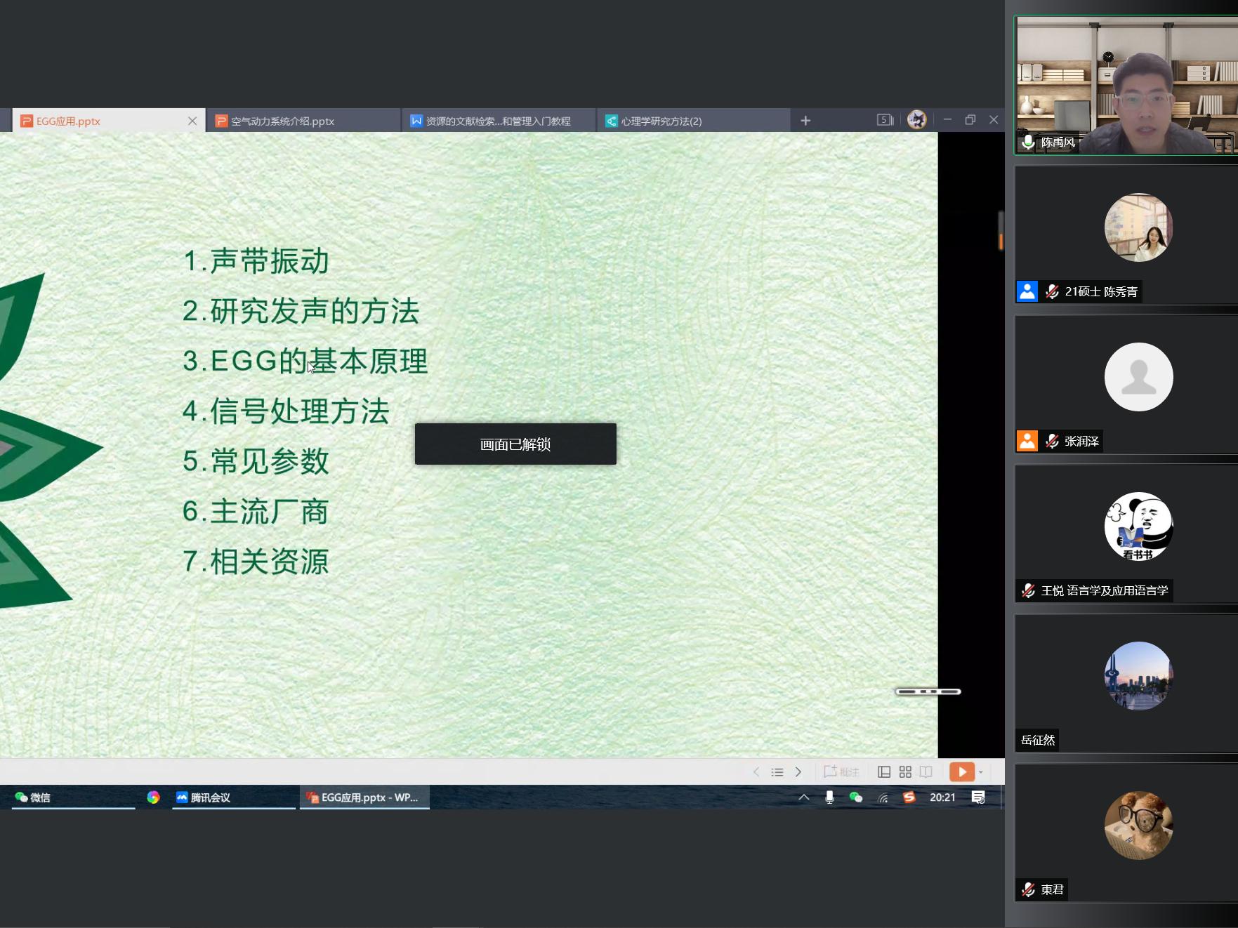 陈禹风从原理角度对以上设备再次进行了简要介绍,并带大家了解了相关研究中的数据处理方式,与病理语音、情感语音、方言等领域的研究对实验方法的运用情况。之后,陈禹风主要讲解了查阅相关实验成果的方法,包括国内和国外的文献,当遇到无校园局域网或学校未购入的情况时,仍可以从相关网站,如各地图书馆、iData等处获取资料,以便随时进行学习、研究。